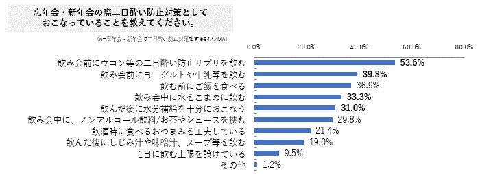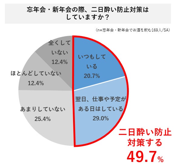 ・忘年会・新年会の際、二日酔い対策をしている人は半数で、対策方法1位は「飲み会前に二日酔い防止サプリを