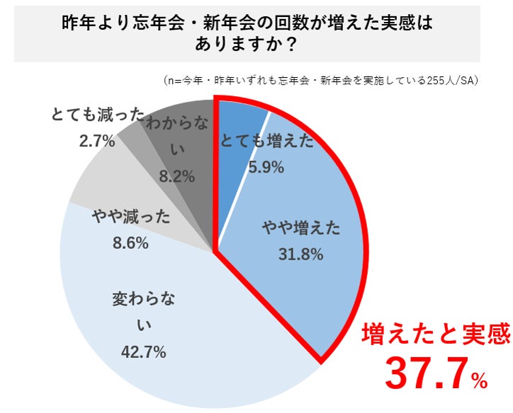・2023年度に忘年会・新年会があった人はおよそ半数。昨年と比較して増加した実感がある人は約4割。