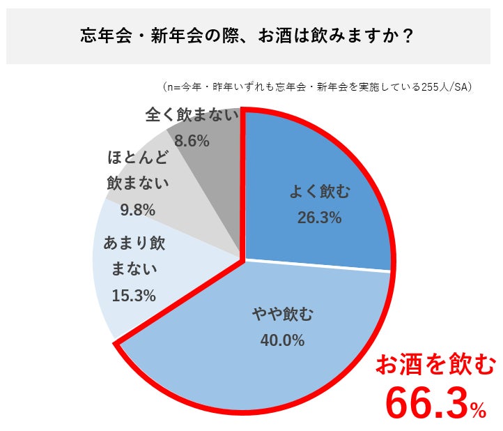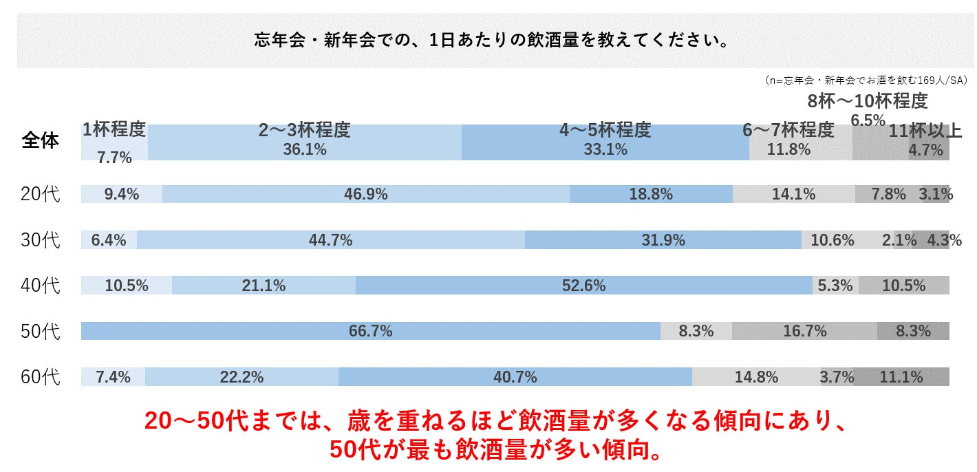 ・忘年会・新年会でお酒を飲む人は66.3%で、1日に飲む量は2〜3杯がボリュームゾーン。