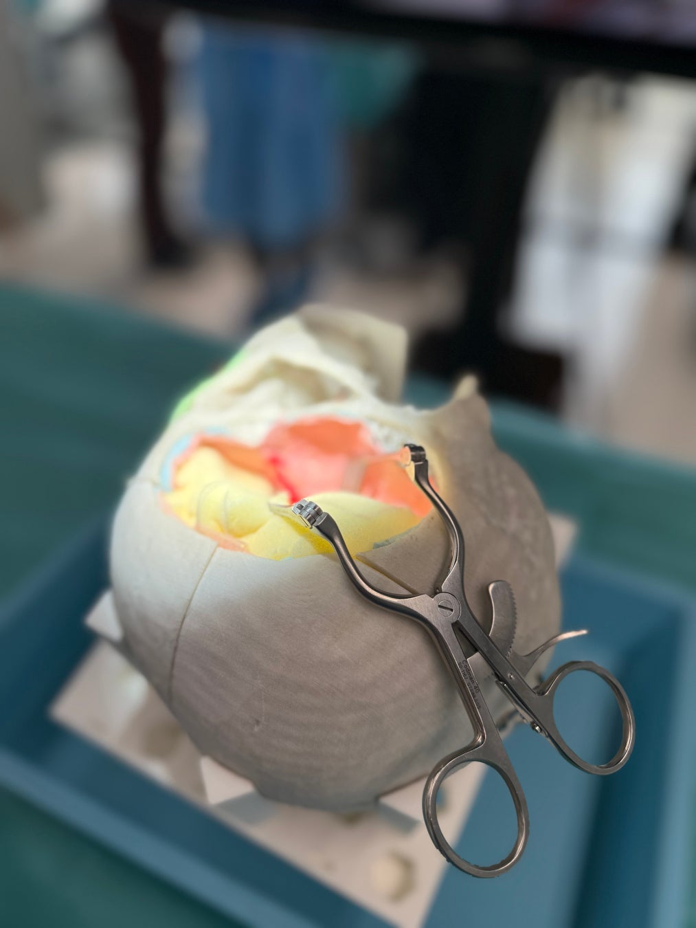 IFNEではその活動の中心に教育を据えており、外科医にとってハンズオンセミナーは極めて重要な機会です。各国のプロフェッショナルからマンツーマンで技術や知識を学び、短時間でもメンターシップを感じられることが大きな成果となります。今回私は、ジャパン・メディカル・カンパニー社と共同開発した透明脳モデルを用いたセッションを担当しました。内視鏡操作を脳の外側から観察することで安全性を担保する方法や技術の限界を理解していただき、開発の目的に沿った感想をいただけたことを嬉しく思っています。また、ジャパン・メディカル・カンパニー社共催のランチョンセミナーでは、医療模型にとどまらず頭蓋骨や頭蓋変形治療に関する幅広い知見が紹介され、参加者の大きな関心を集めました。