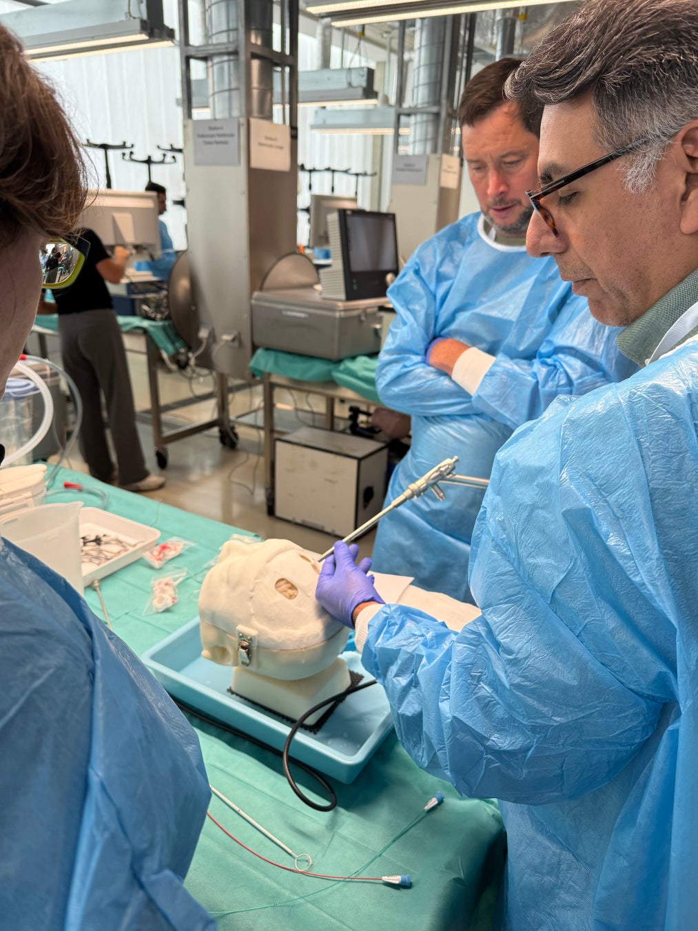今回開催された11th IFNE World Congressのプレコングレスではハンズオンコースが開催されました。私は九州大学脳神経外科・空閑先生にご協力をいただき、ジャパン・メディカル・カンパニー社製の内頚動脈(ICA)損傷モデルを用いた止血トレーニングを担当いたしました。ICA損傷は発生頻度こそ低いものの致死的となり得る重大合併症であり、平時からのシミュレーションと、発生時に適切に対応できる準備が重要です。本モデルは毎回大きな反響をいただきますが、今回も受講生のみならず他ブースの講師の先生方にも高い関心を寄せていただきました。