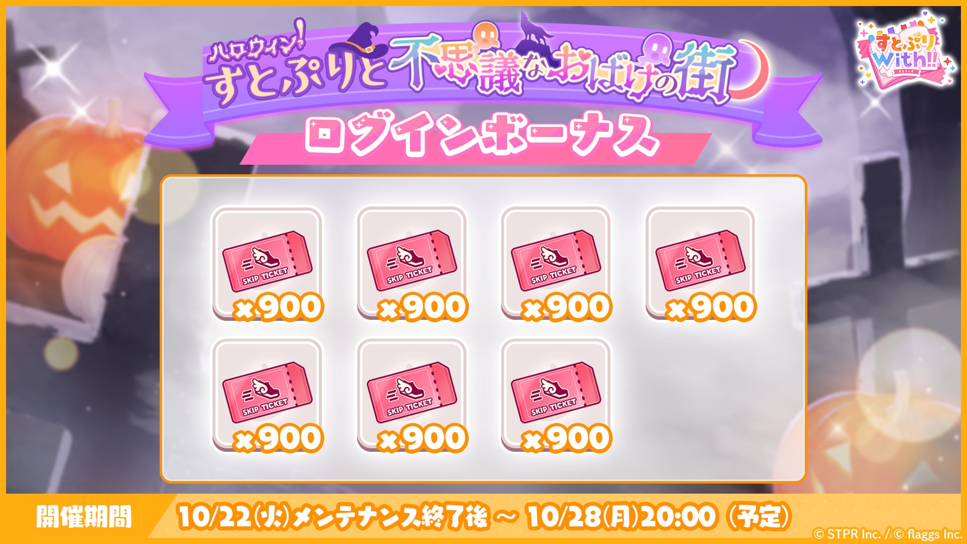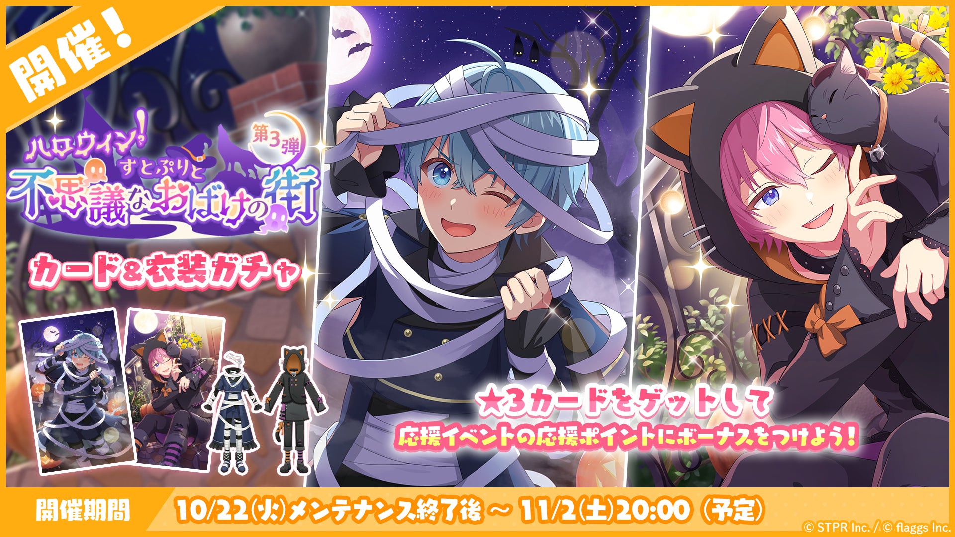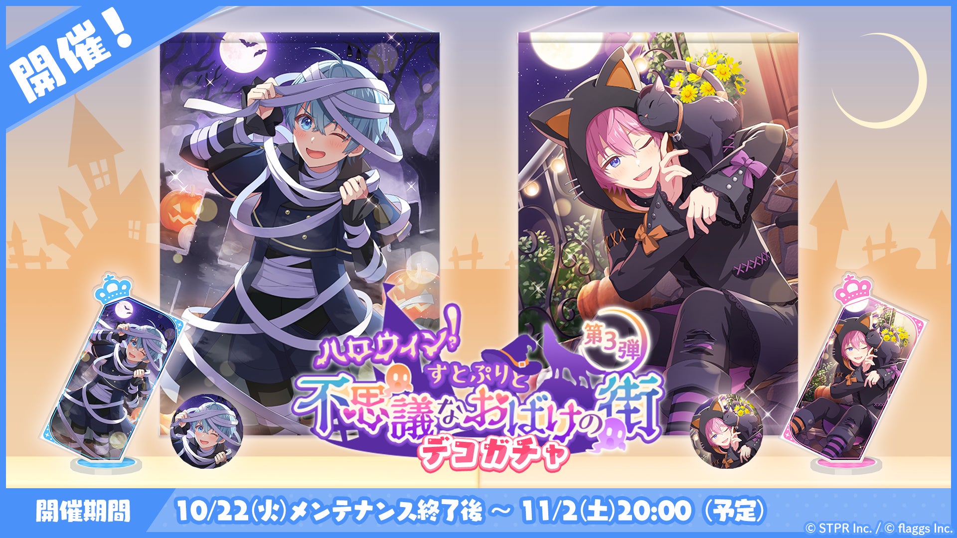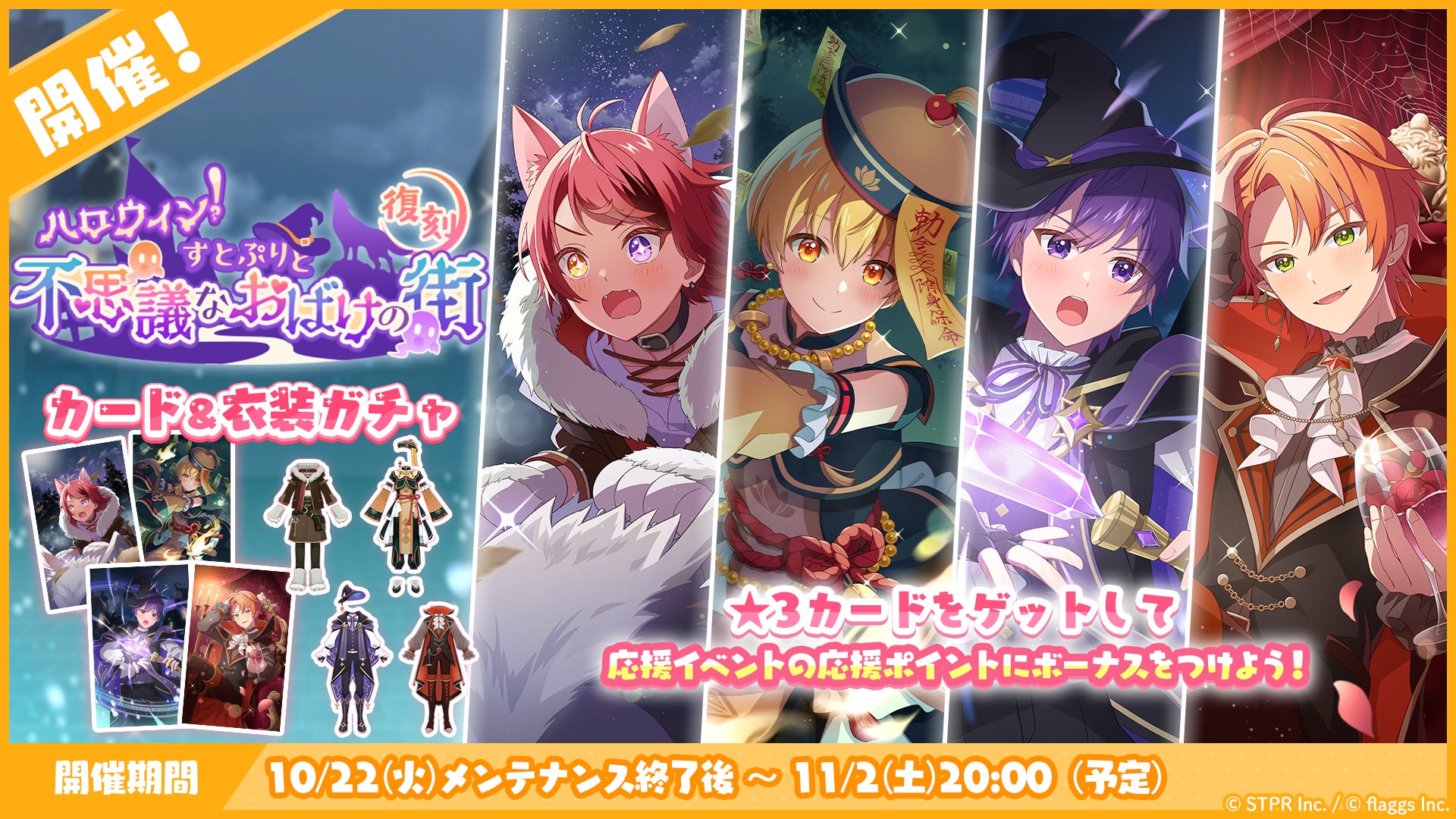 株式会社flaggs(フラッグス)(本社:東京都品川区、代表取締役CEO:吉江 直人)と株式会社STPR(本社:東京都渋谷区、代表取締役:柏原 真人、以下STPR)は、本日10月22日(火)に2.5次元アイドルグループ「すとぷり」の公式ゲームアプリ「すとぷりWith!!(通称:すとうぃず)」のゲーム内イベント「ハロウィン!すとぷりと不思議なおばけの街 応援イベント」の開催についてお知らせいたします。