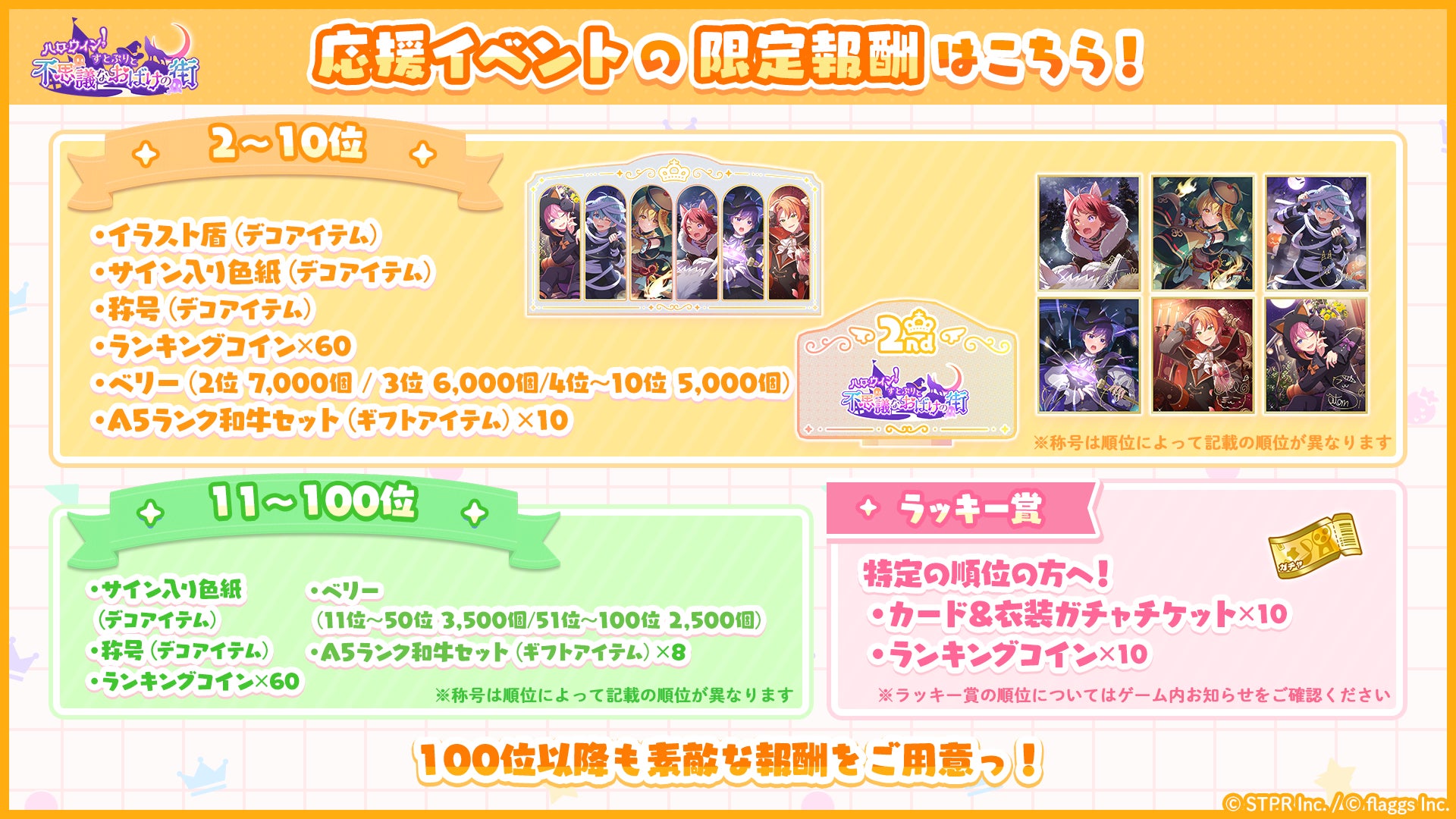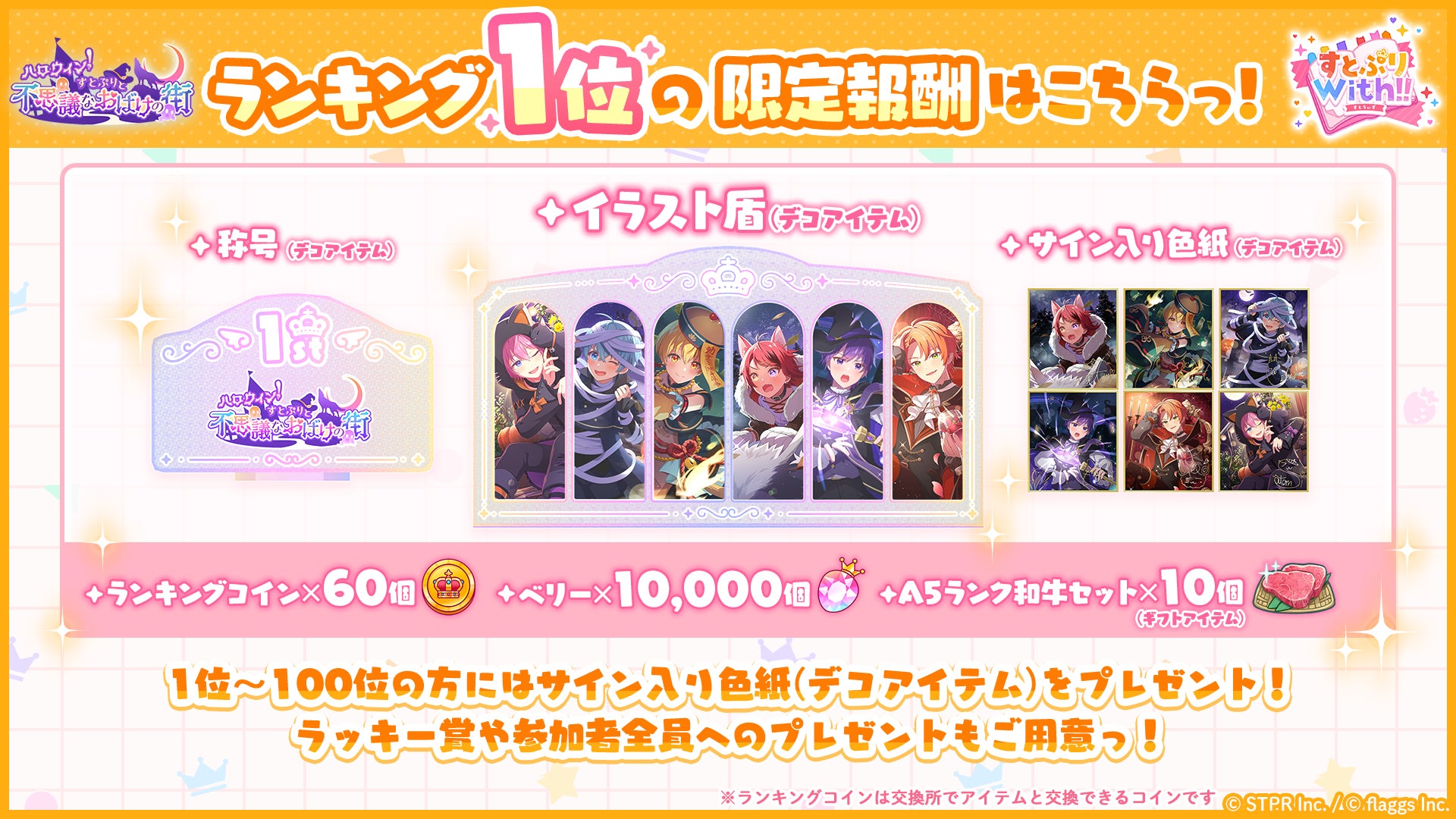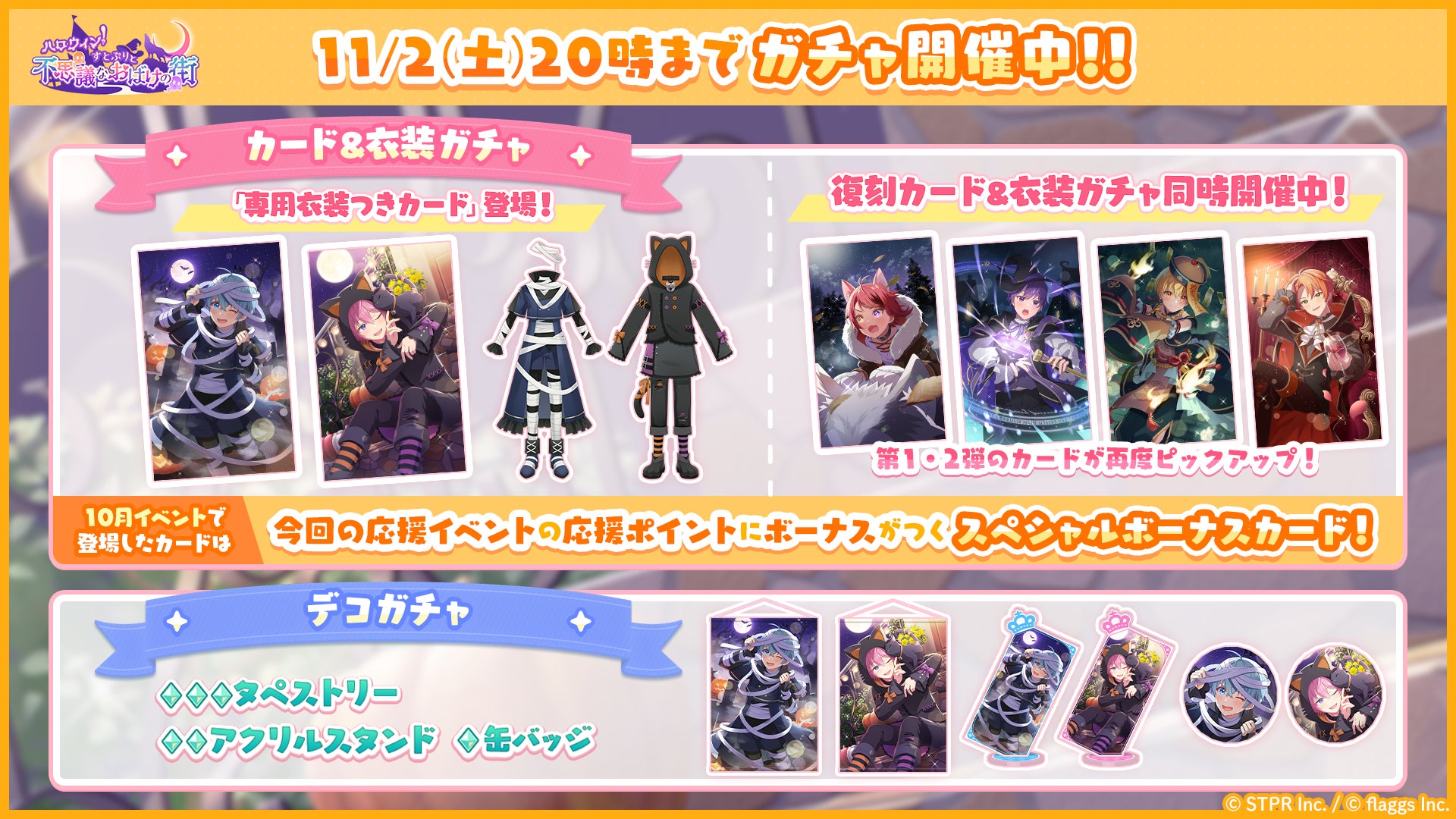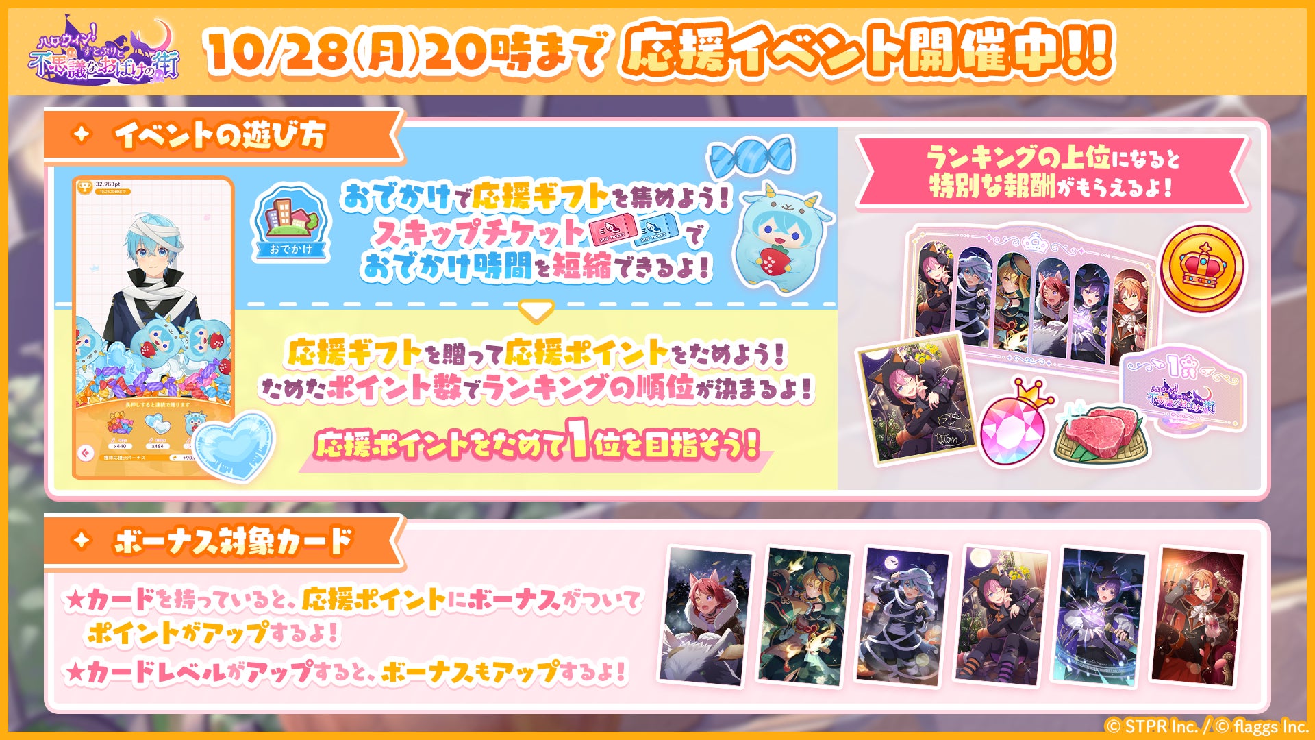 株式会社flaggs(フラッグス)(本社:東京都品川区、代表取締役CEO:吉江 直人)と株式会社STPR(本社:東京都渋谷区、代表取締役:柏原 真人、以下STPR)は、本日10月22日(火)に2.5次元アイドルグループ「すとぷり」の公式ゲームアプリ「すとぷりWith!!(通称:すとうぃず)」のゲーム内イベント「ハロウィン!すとぷりと不思議なおばけの街 応援イベント」の開催についてお知らせいたします。