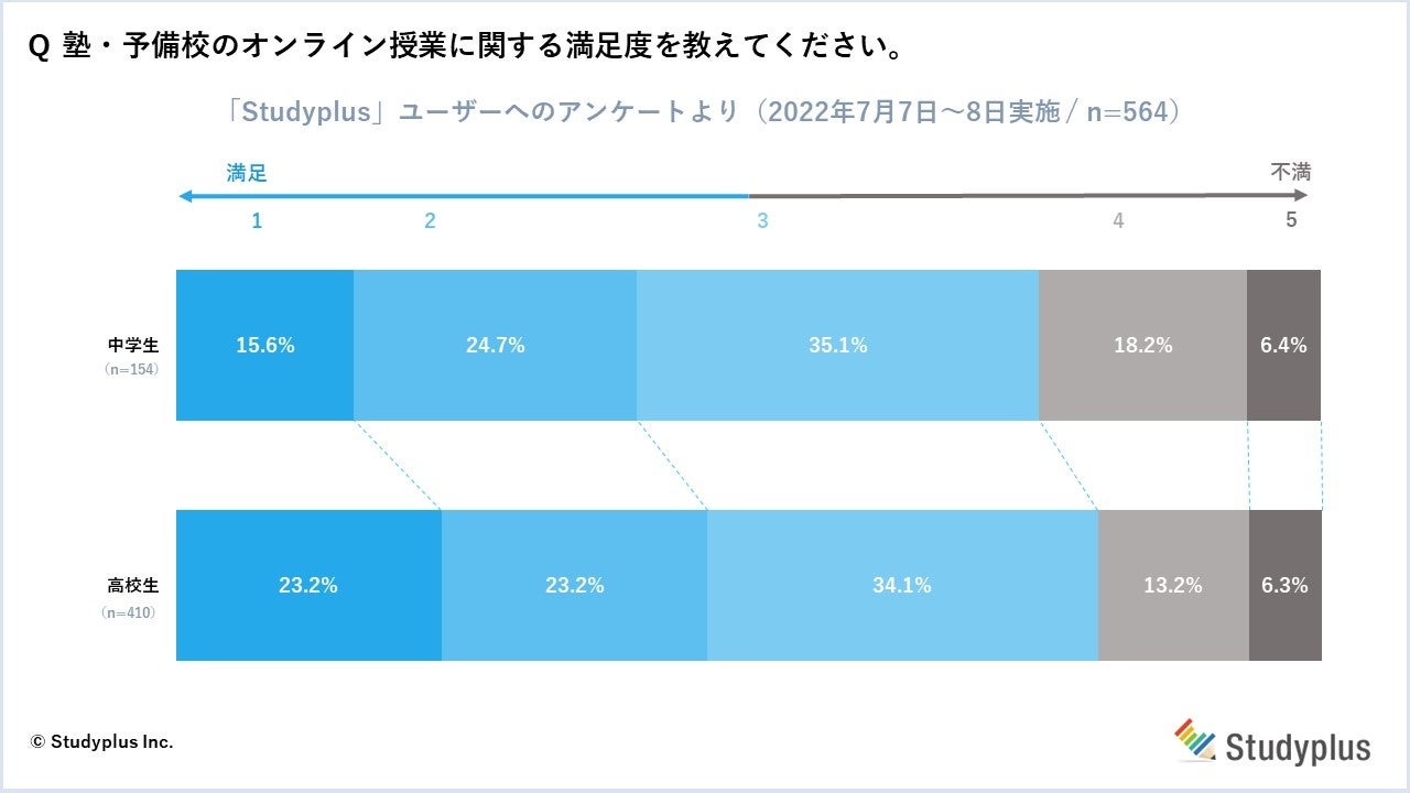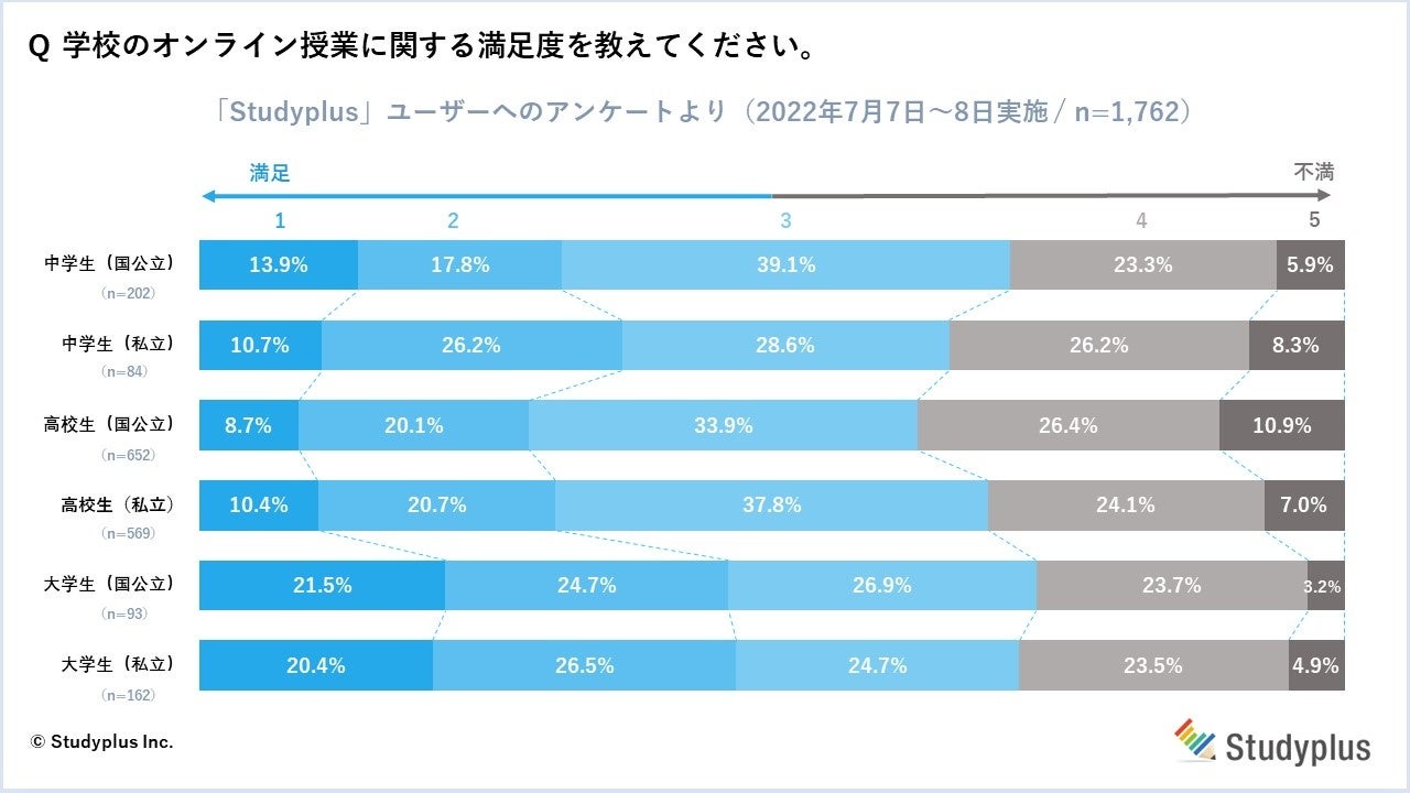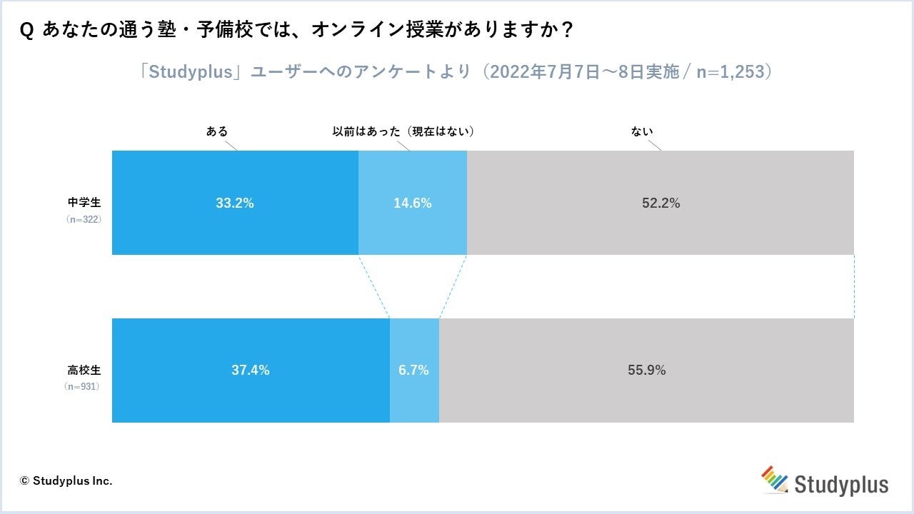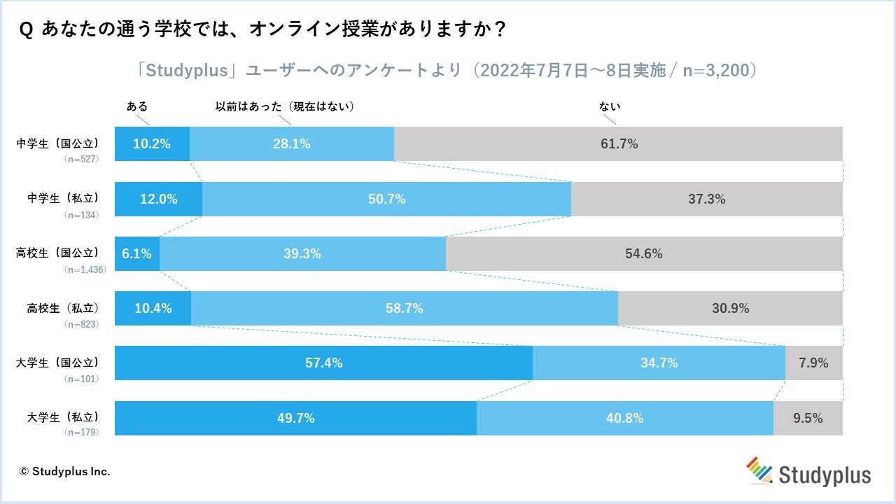 スタディプラス株式会社(本社:東京都千代田区、代表取締役:廣瀬高志、以下スタディプラス)のStudyplusトレンド研究所は、2022年7月7日~7月8日にかけて、学習管理アプリ「Studyplus」上で中学生・高校生・大学生のユーザーを対象に「オンライン授業に関するアンケート調査」を実施、『学校でのオンライン授業』に関してはユーザー3,200人から、『塾・予備校でのオンライン授業』に関してはユーザー1,253人から、調査に対する回答を得ましたので概要をご報告します。