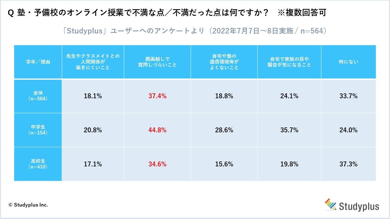 ・最も多かったのは「画面越しで質問しづらいこと」であり、学校と同じ要素で不満が残っている結果に。