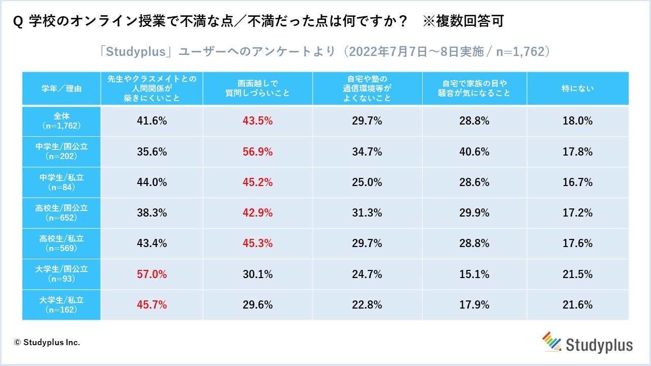 ・中高生が不満に感じた項目1位は「画面越しで質問しづらいこと」、大学生が不満に感じた項目1位は「先生やクラスメイトとの人間関係が築きにくいこと」という結果に。