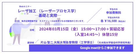本セミナーは光業界に関わるあらゆる方(研究者・候補者(学生)の方、企業 研究開発部門の方等)を対象に、レーザー業界に精通されている、大阪大学接合科学研究所の片山聖二 名誉教授を新講師としてお招きし、レーザ加工 (レーザープロセス学)―基礎と実際― の解説をいただきます。本セミナーは全6回を予定しております。