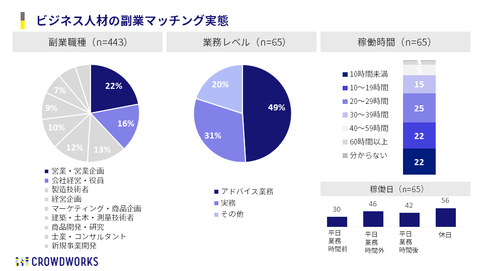 ビジネス・コーポレート人材の副業案件は、専門的知識を活用して企業や担当者に対してさまざまな助言や提案を行う「アドバイス業務」が多く、副業先企業とコミュニケーションを取る必要があるため、平日の業務時間外に副業を行っていることがわかりました。特にビジネス人材は、平日に副業先の業務時間に合わせて打ち合わせなどのコミュニケーションを必要とする業務を行い、休日に資料作成をするなど平日・休日を上手く使い分けて業務を行っている傾向が見られました。
