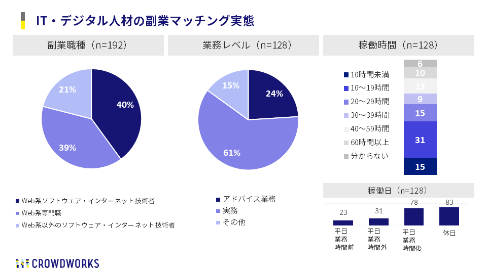 - IT・デジタル(*3)人材向けの案件は実務が6割、平日の業務時間後または休日に作業する傾向あり