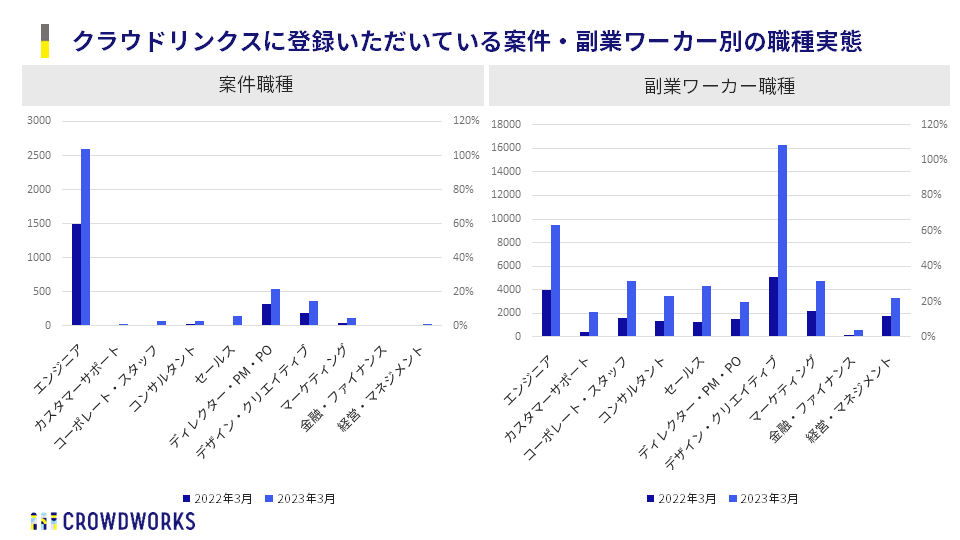 クラウドリンクスに登録されている副業案件・ワーカーの職種について、2022年3月と2023年3月を比較したところ、案件ベースで最も増加した職種は ”エンジニア” であり、副業ワーカーベースで最も増加した職種は ”デザイン・クリエイティブ”であることがわかりました。どちらも高い専門スキルを必要とする”クリエイティブ”領域であり、労働市場全体で人材不足となっているため、副業の活用により不足している労働力を確保しようとする動きが広がっています。