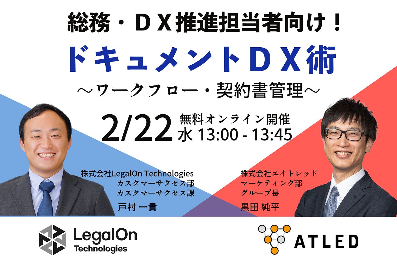 業務手続きの電子化(ワークフローシステム)大手の株式会社エイトレッド(本社:東京都渋谷区、代表取締役社長:岡本 康広 以下、エイトレッド)は、株式会社LegalOn Technologiesと共催で『<総務・DX推進担当者向け!>ドキュメントDX術 ~ワークフロー・契約書管理~』を2023年2月22日(水)にオンラインにて開催いたします。