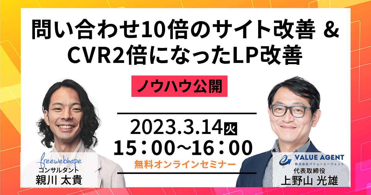 株式会社free web hopeは、株式会社バリューエージェントと共催セミナー「問い合わせ10倍のサイト改善 & CVR2倍になったLP改善 ノウハウ公開」を3月14日(火)15:00より開催いたします。(申し込みURL:https://valueagent.co.jp/seminar/free-web-hope)