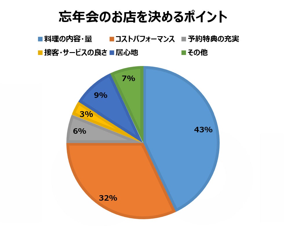 お店を決めるポイントについては、昨年に続き「料理の内容・量」「コストパフォーマンス」が上位を占めており、“しっかり食べてしっかり飲める”お店への支持が根強く続いています。
