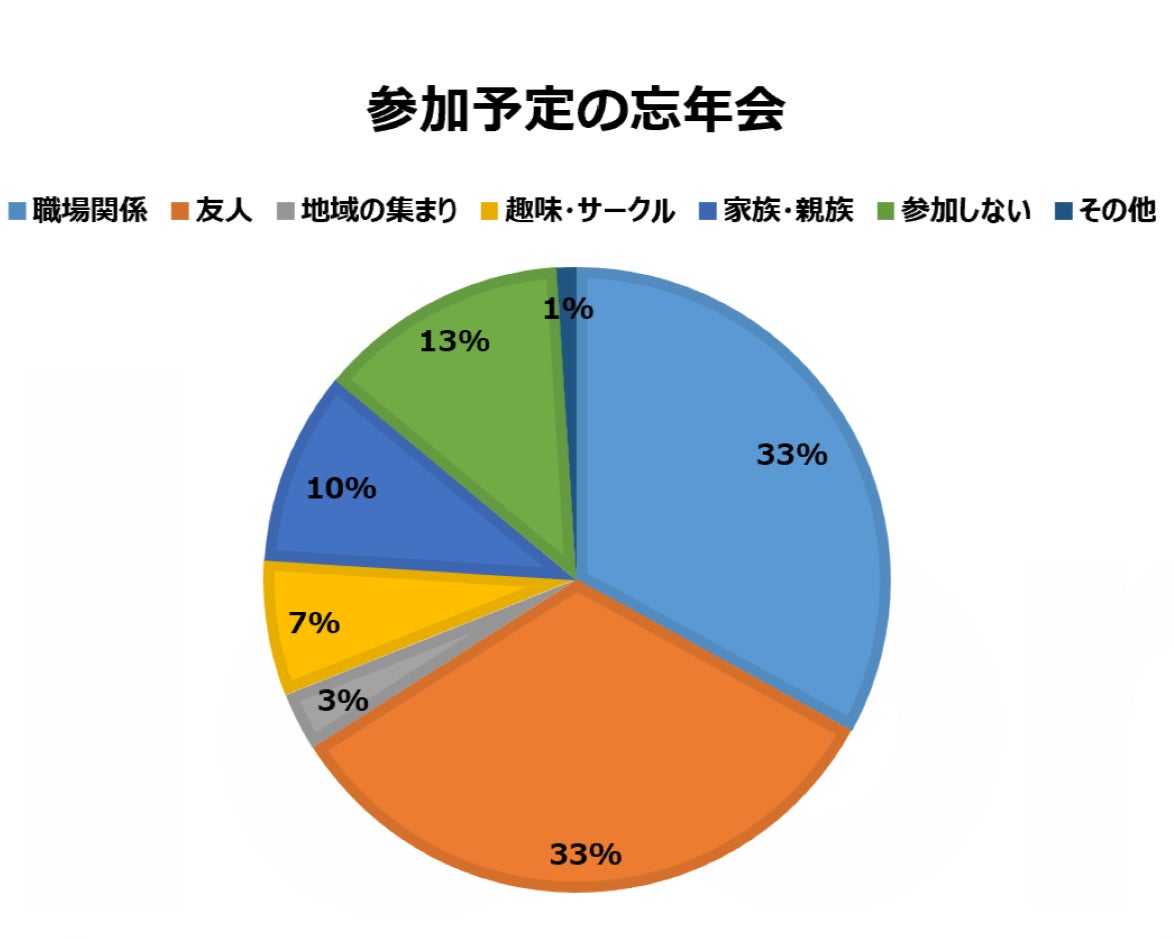 さらに、「参加予定の忘年会」については、「職場関係(33%)」と「友人(33%)」が同率で上位に。仕事納めの打ち上げや、気の合う仲間・家族との食事など、さまざまなシーンで忘年会を楽しむ傾向が見られました。