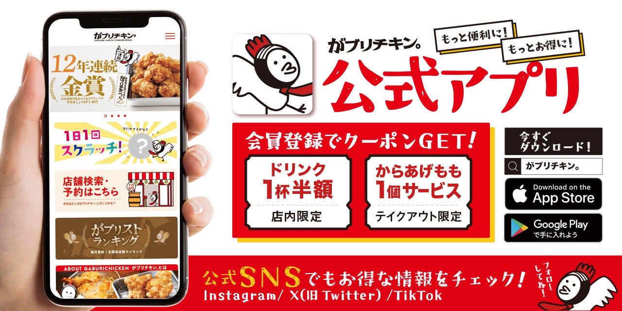 「がブリチキン。」公式アプリでは、最新の情報やお得なクーポンを定期的に配信中!