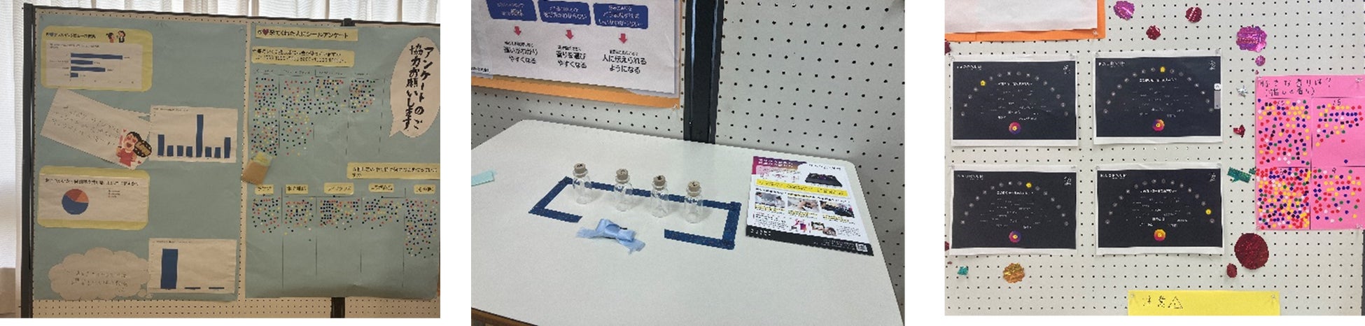 生徒たちは、まず香りの基礎知識を学んだ上で、KAORIUMを活用し各々が思い描く推しのイメージを言葉で表現し、香りとマッチングする体験を行いました。展示では、KAORIUMで創出された感性言葉と香りを展示し、来場者に体験いただけるようにしました。さらに、推しと香りの人気投票を実施することで、多くの来場者が楽しみながら新しい体験を行いました。