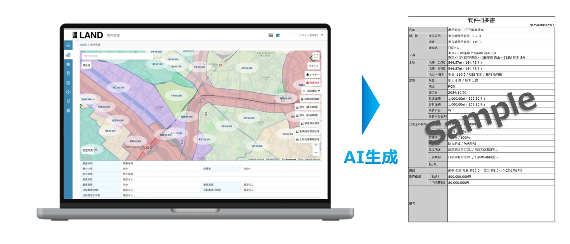 「ZISEDAI LAND」では、AIにより最新の都市情報を自動取得することができ、学習データと独自の地理情報システム(GIS:Geographic Information System)によって、用地情報を入力するだけで、建ぺい率、容積率、日影規制(※)などの各種建築規制をマップ上に表示し、用地のスピーディーな事業性評価を実現します。