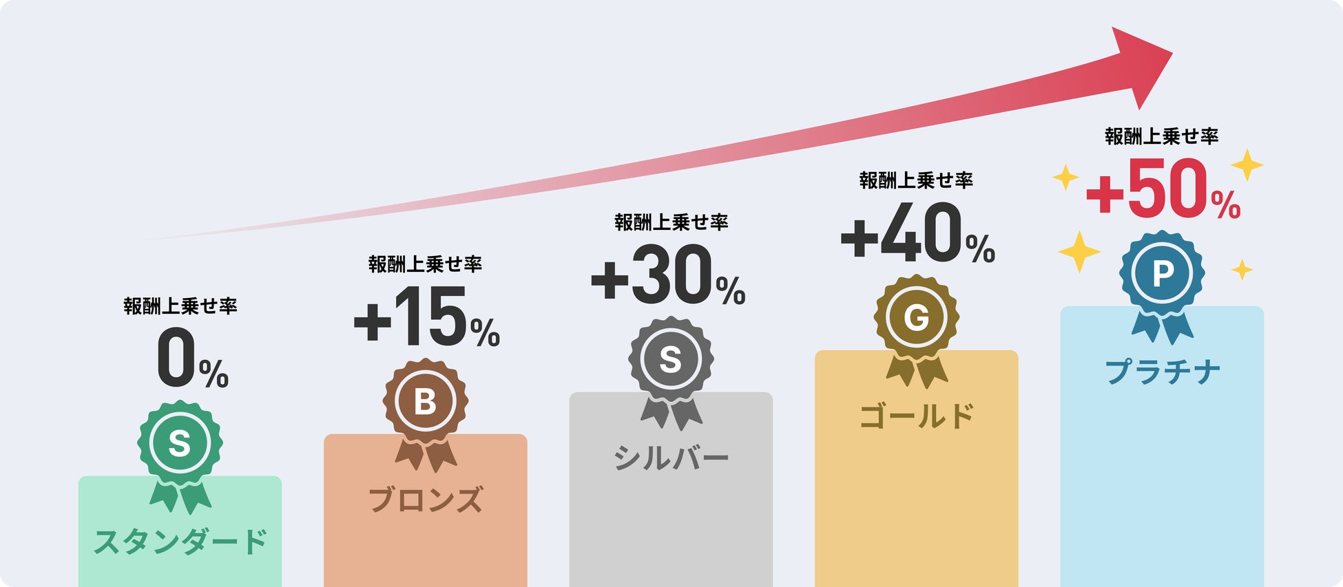 上位ランクの紹介者には、高報酬案件への優先案内や限定特典など、より有利な条件で活動いただける仕組みをご提供します。