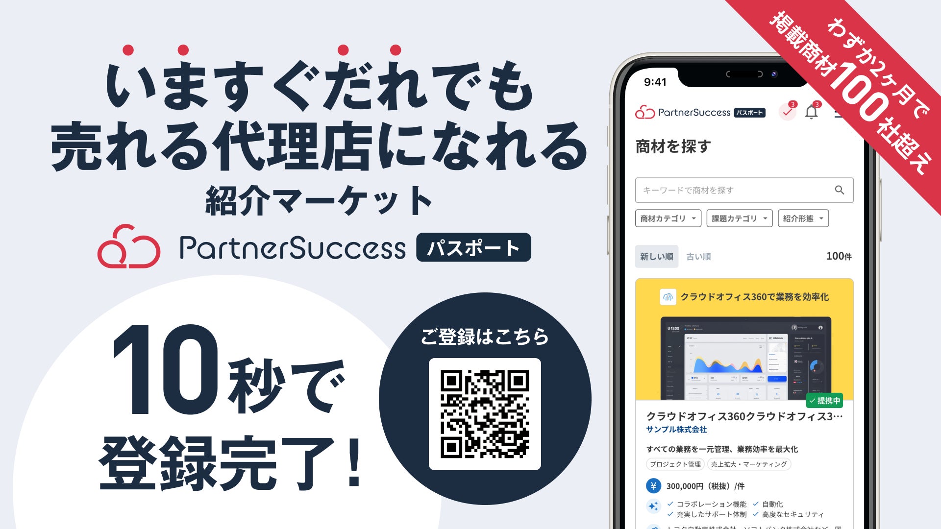 パートナーサクセス株式会社(本社:東京都港区、代表取締役 CEO:永田雅裕)は、いますぐ だれでも 売れる代理店になれる 紹介マーケット「PartnerSuccess パスポート」を正式リリースいたしました。