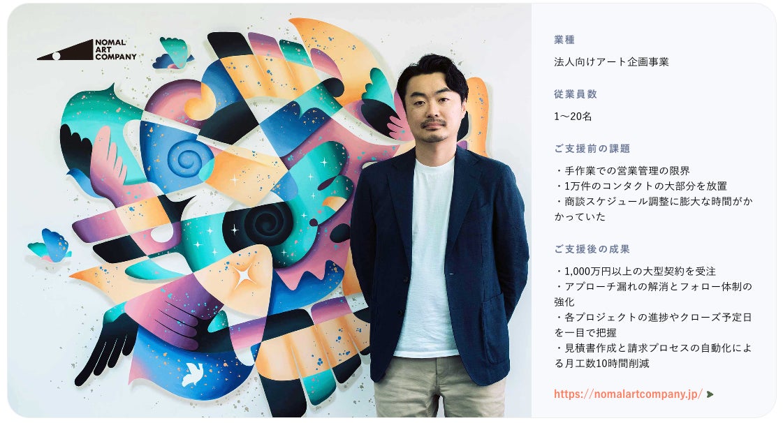 株式会社NOMALは、「チャレンジする人の背中を押す事業を創り続ける」というビジョンのもと、企業のオフィス空間にアートを取り入れる「ウォールアート事業」を展開しています。同社は、代表と副社長による人脈営業を軸に事業を成長させてきましたが、以下の課題が明らかになりました。