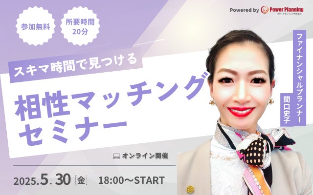 無料マネーセミナー提供サービス「アットセミナー」を運営しているパワープランニング株式会社が「5月30日(金) 18時」に「相性マッチングセミナー」というスキマ時間で自分に合ったFPを見つけられるオンラインセミナーを開催いたします。