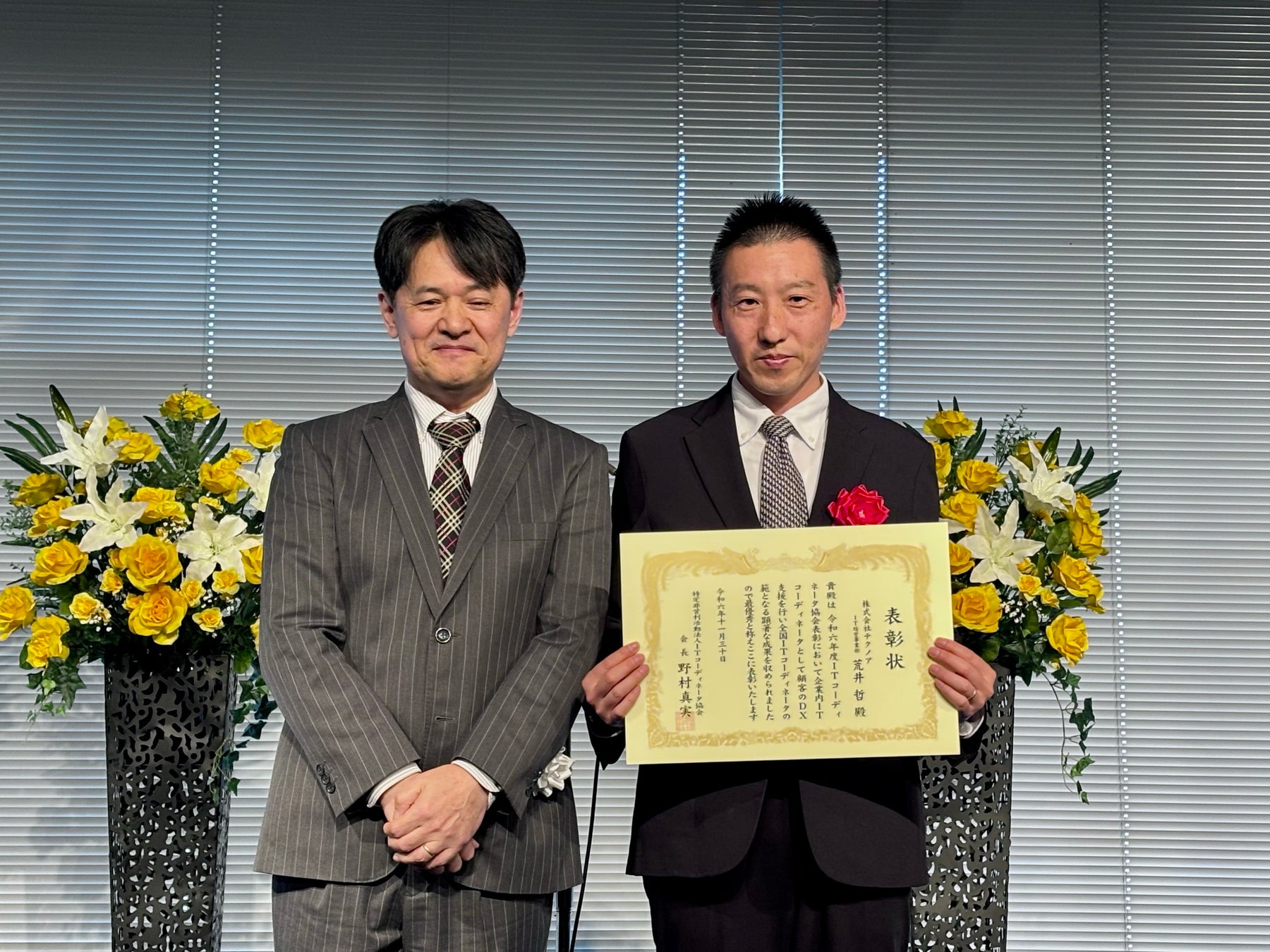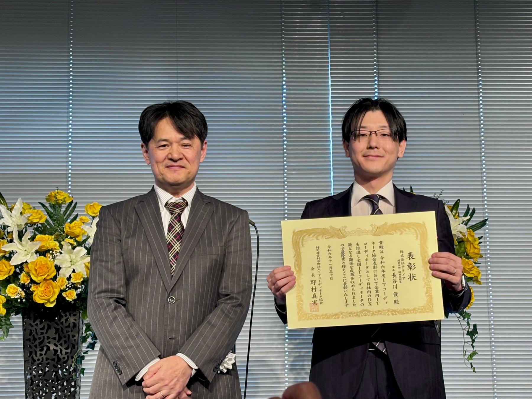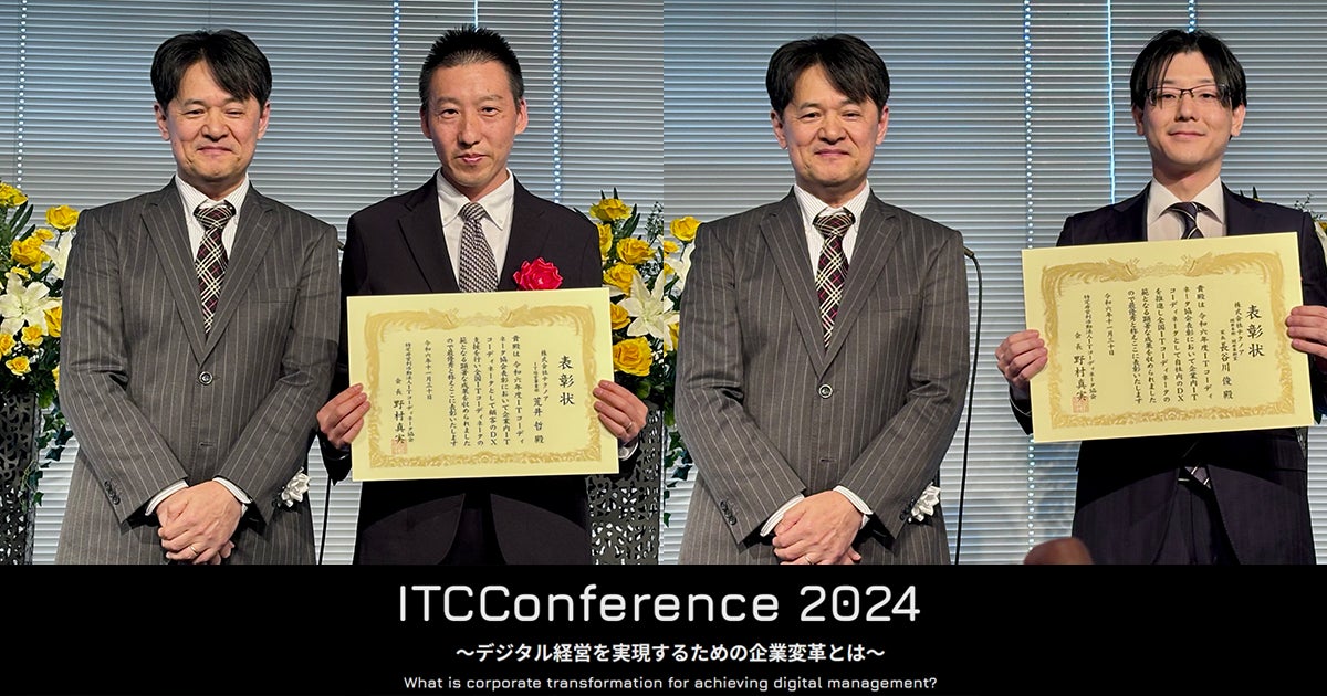 株式会社テクノア(本社:岐阜県岐阜市、代表取締役:山﨑耕治、以下テクノア)は、2024年11月30日(土)に開催された「ITCカンファレンス2024」にて、2名の社員が「ITコーディネータ協会表彰2024」で受賞したことをお知らせいたします。
