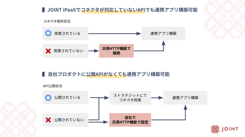 また、自社プロダクトに公開APIがない場合も汎用HTTP機能を利用しJOINT iPaaS for SaaS上で連携アプリの構築が可能になります。
