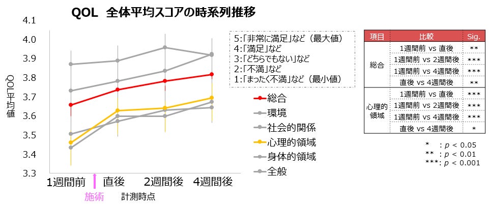WHO QOL26※を用いて測定したところ、ヘアカラーリング1週間前~4週間後において生活の質に関する総合スコアが向上し続けており、ヘアカラーリングは継続的な生活の質の向上に効果があることが明らかとなりました。質問票は、身体・心理・社会・環境の4領域に関する設問で構成されており、特に心理的領域において顕著な改善が見られました。