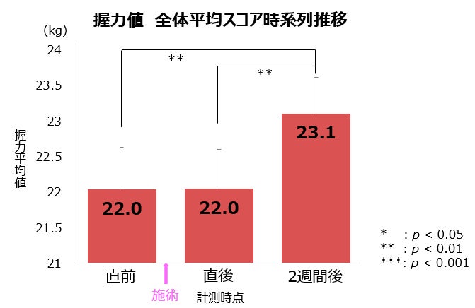 また、ヘアカラー前と2週間後では握力の有意な向上も確認され、この期間における行動変容(人と会う機会の増加など)が影響した可能性が考えられます。