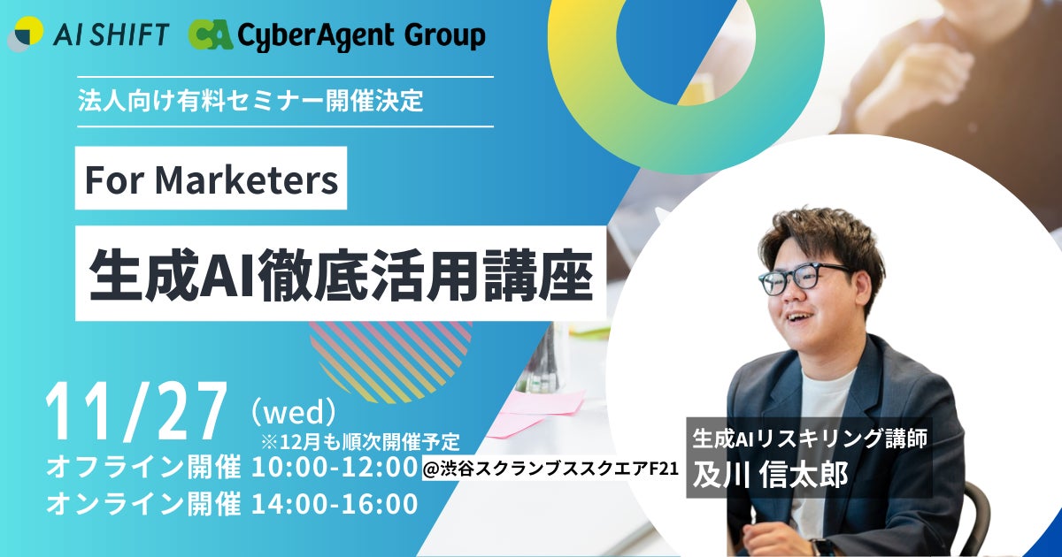 株式会社サイバーエージェント(本社:東京都渋谷区、代表取締役:藤田晋、東証プライム市場:証券コード4751)の100%子会社で、生成AIを活用した業務改革を総合的に支援する株式会社AI Shift(本社:東京都渋谷区、代表取締役社長:米山結人)は、マーケターに特化した生成AI徹底活用セミナーを企業向けに開催いたします。