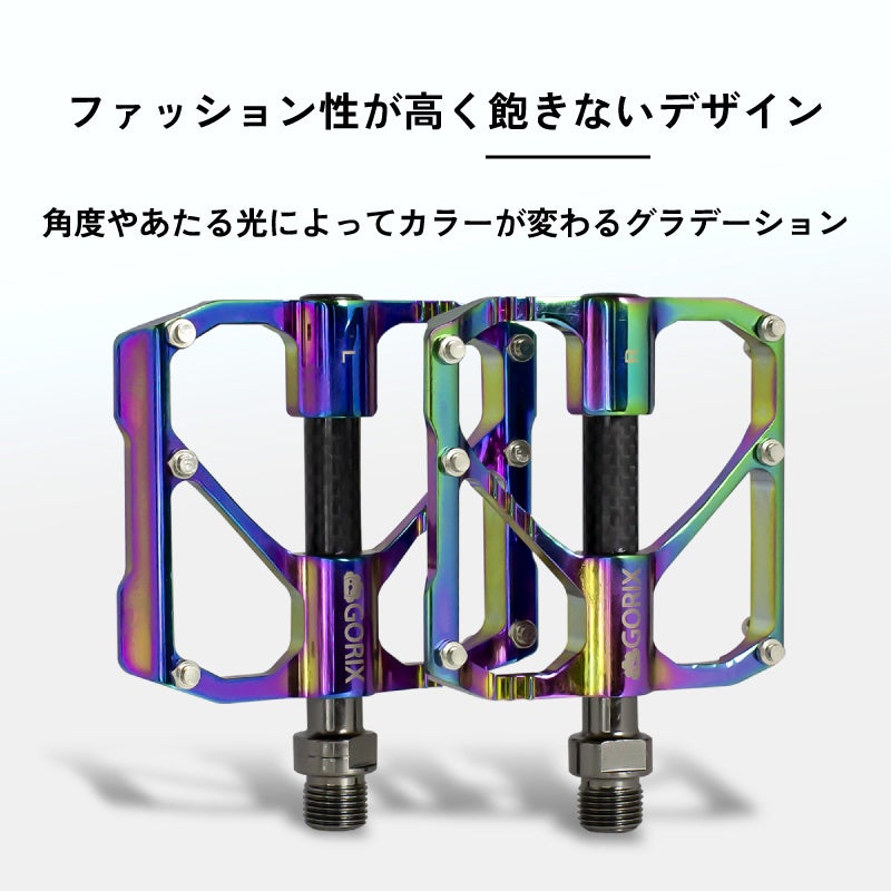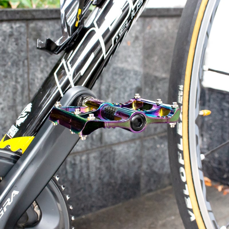 軽量で耐久性も兼ね備えているので、デザインだけでなく実用性も高い自転車ペダルです。人気のオイルスリックカラーで、足元からおしゃれにカスタイマイズ可能です。