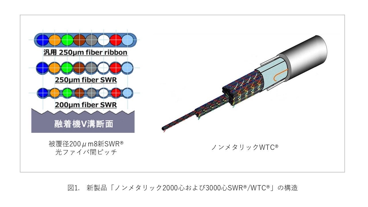 新製品「ノンメタリック2000心および3000心SWR®/WTC®」は、多心一括融着接続が可能な8心光ファイバリボンSWR®を当社独自技術のWTC®に実装したノンメタリック仕様の光ファイバケーブルです。