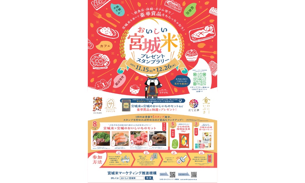 現在開催中の「おいしい“宮城米”プレゼントスタンプラリー」は、提供店のうち全国の対象店舗でお食事または商品を購入するとスタンプが貯まり、取得スタンプ数に応じて仙台牛など宮城のおいしいものや宮城米の食べ比べセットが当たるキャンペーンです。