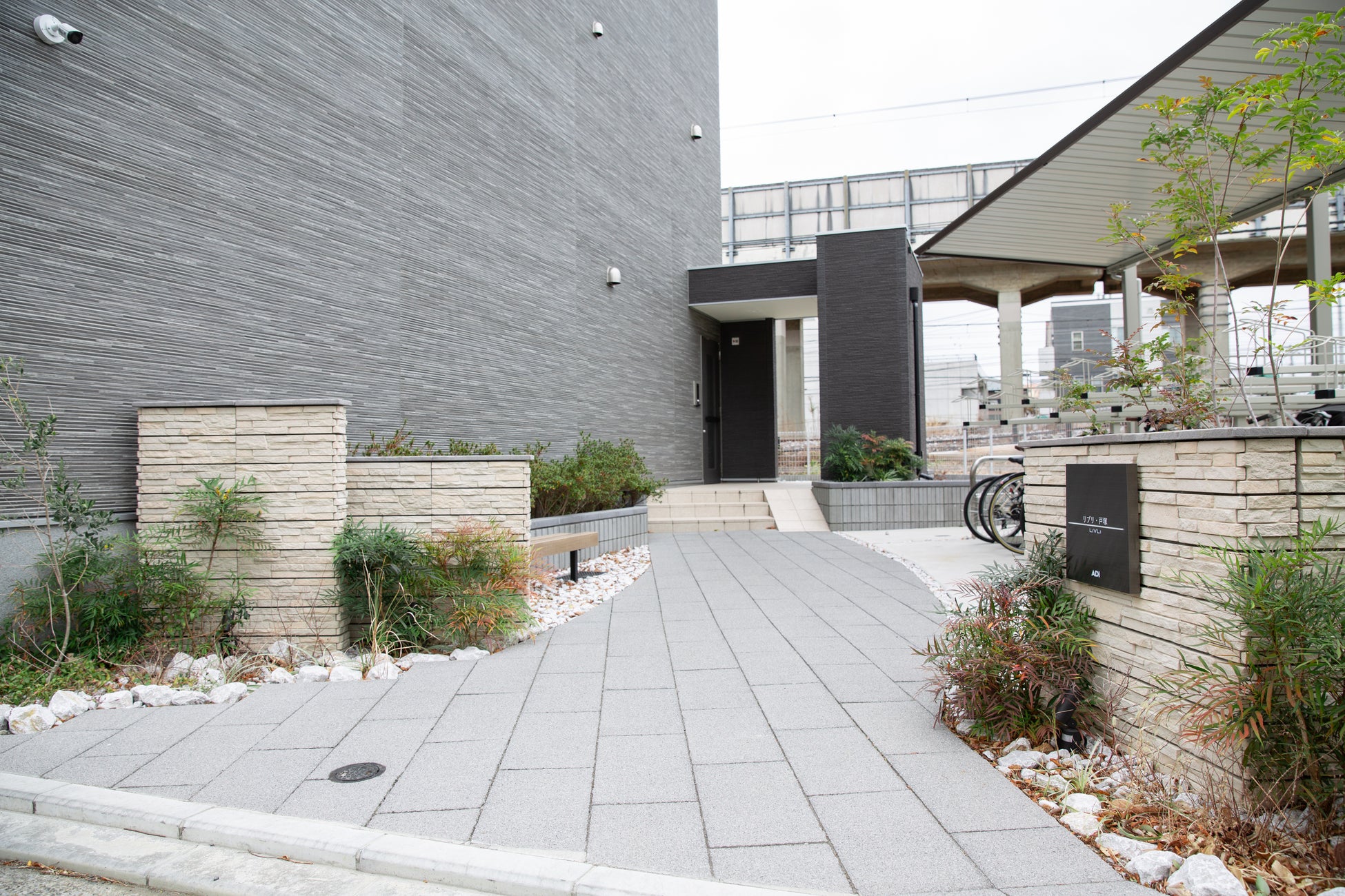 本物件はエントランスから道路までのアプローチが末広がりの形状となっており、駐輪場を視線から巧みに隠しながら空間を構成しています。