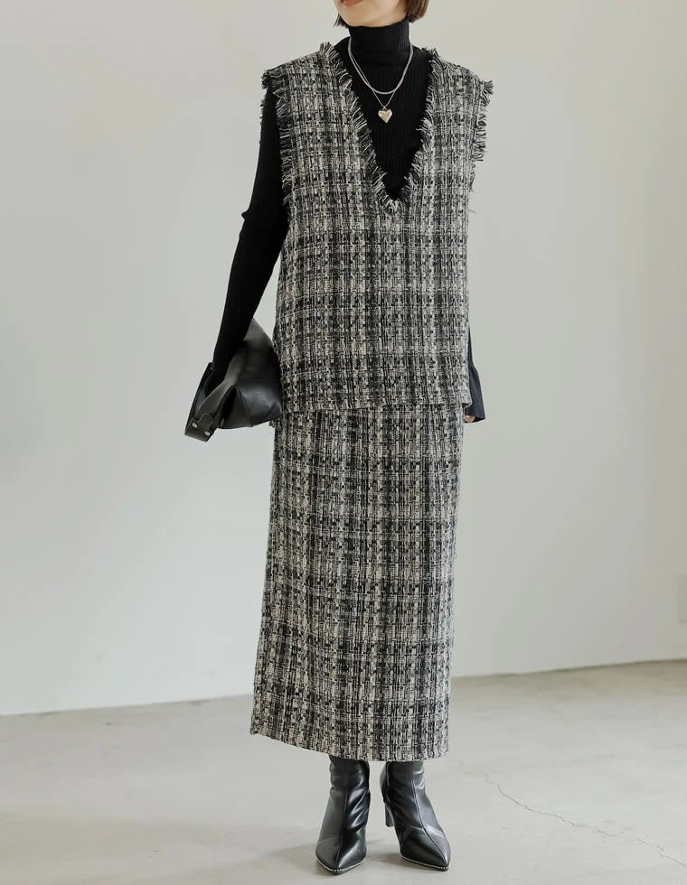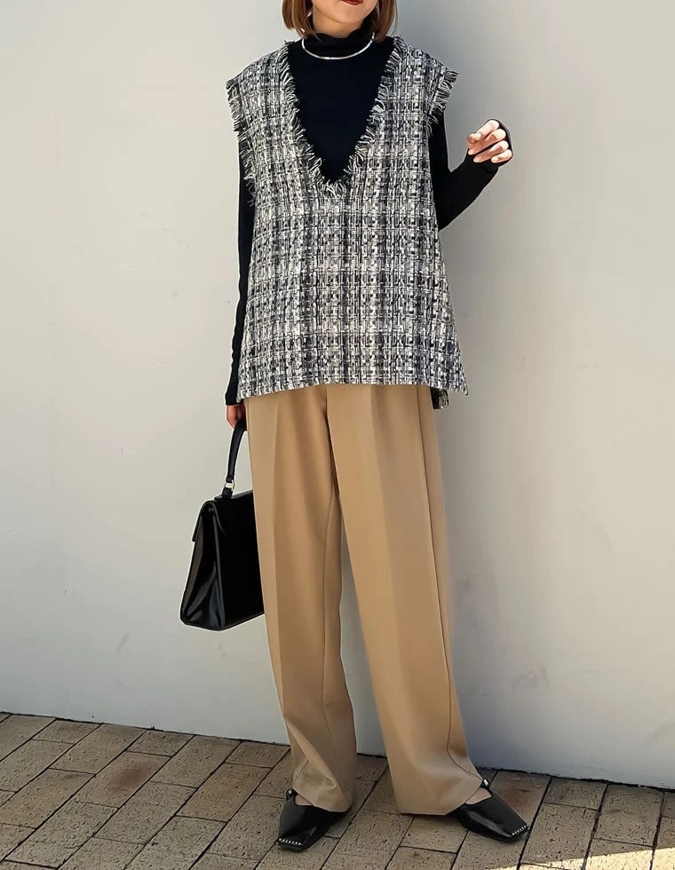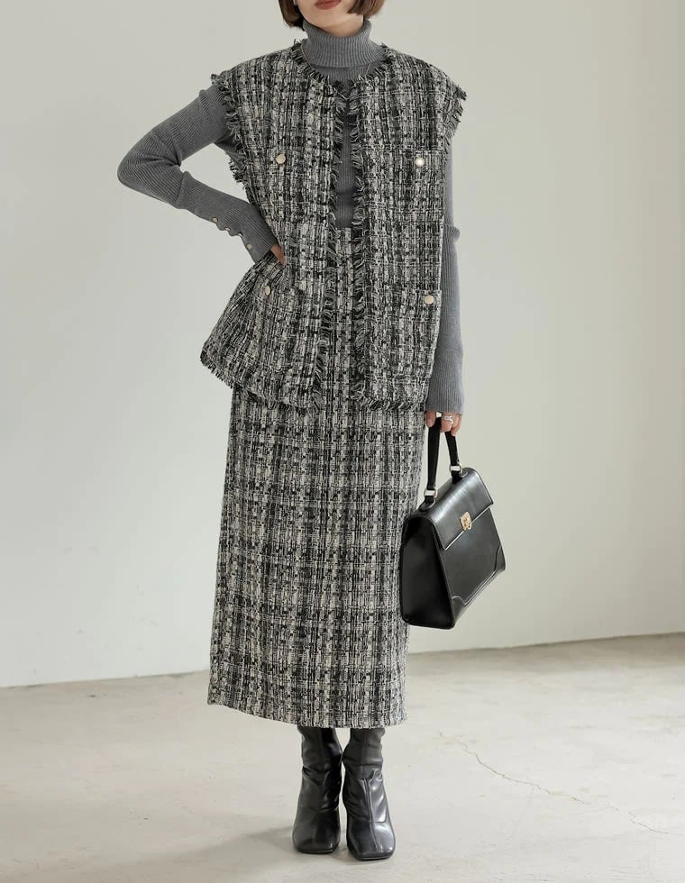 洗練された大人の雰囲気に仕上がるツイードアイテム。