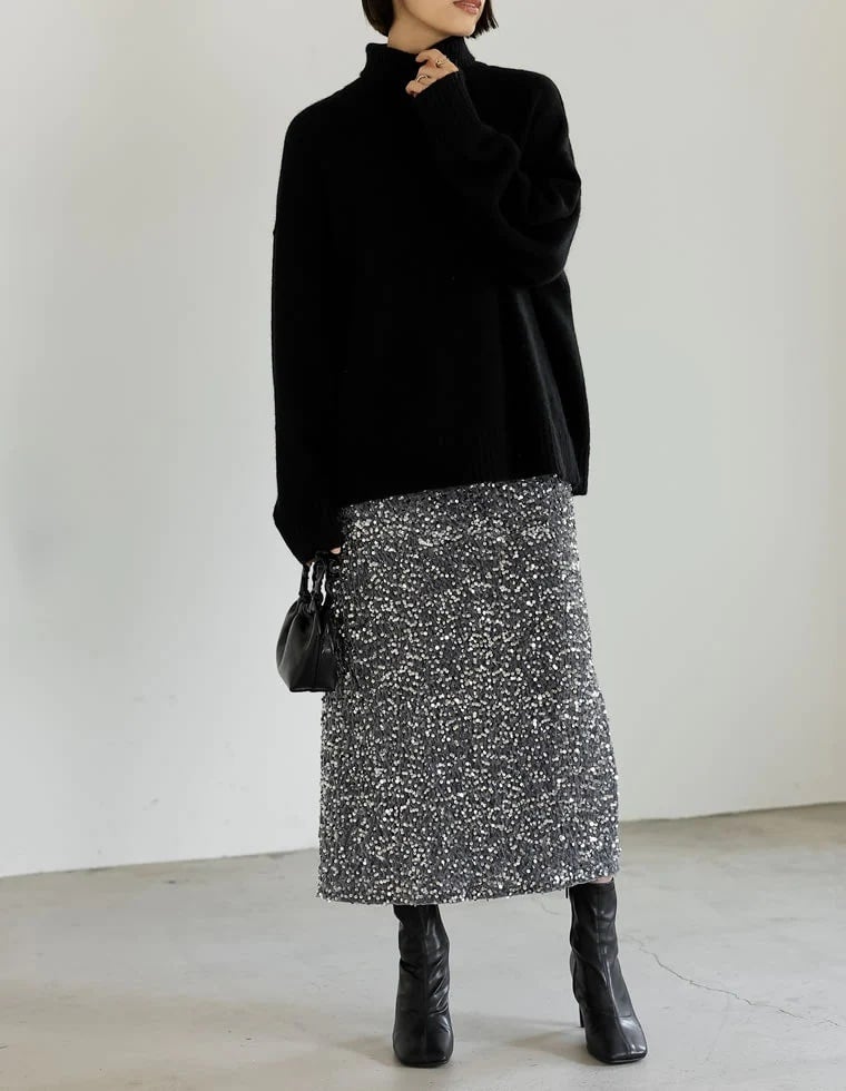 穿くだけで旬な印象にしてくれるスパンコールスカートを使ったおすすめのコーディネートです。