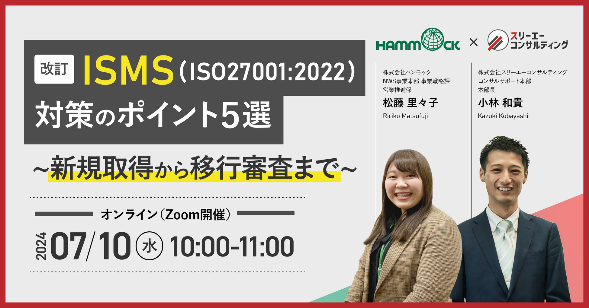【ハンモック × スリーエーコンサルティング|共催】「【改訂】ISMS(ISO27001:2022)対策のポイント5選 ~新規取得から移行審査まで~」無料ウェビナー7/10(水)10:00~開催