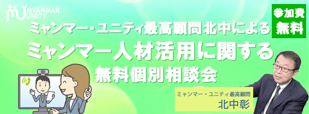 ミャンマーの優秀で豊富な人材がこれからの日本を救います。「ミャンマー人材活用に関する無料個別相談会」受付開始。(技能実習・特定技能・技人国)ミャンマー・ユニティ最高顧問の北中が直接ご相談を承ります。
