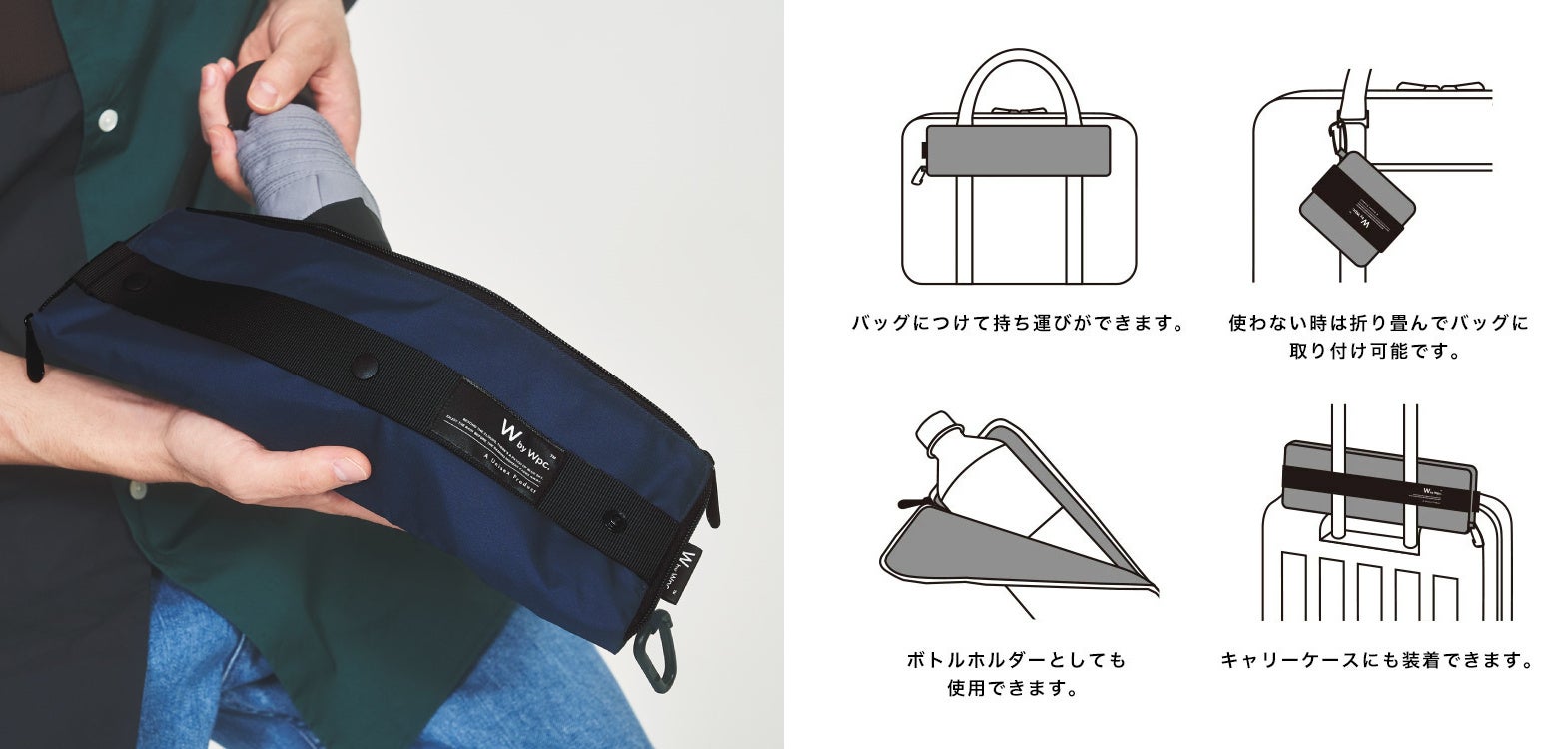 ビジネスシーンで使用することを想定したアンブレラケースは、キャリーケースやビジネスバッグに装着できる仕様。こちらも内側は吸水素材を使用しているので雨粒をしっかりと吸ってくれます。
