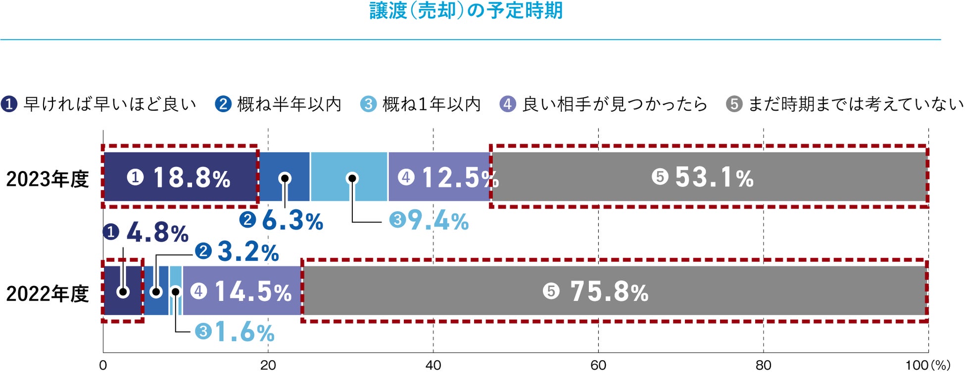 譲渡の時期について尋ねたところ、「早ければ早いほど良い」と回答した企業は18.8%という結果に。前年対比で14.0ポイント増加となりました。一方、「まだ時期は考えていない」との回答は53.1%となり、前年対比で22.7ポイント減と大幅に減少しました。譲渡時期未定の層が減り、「早ければ早いほど良い」という回答が顕著に増える結果となりました。譲渡する覚悟が決まれば、スピードを重視していることがうかがえます。