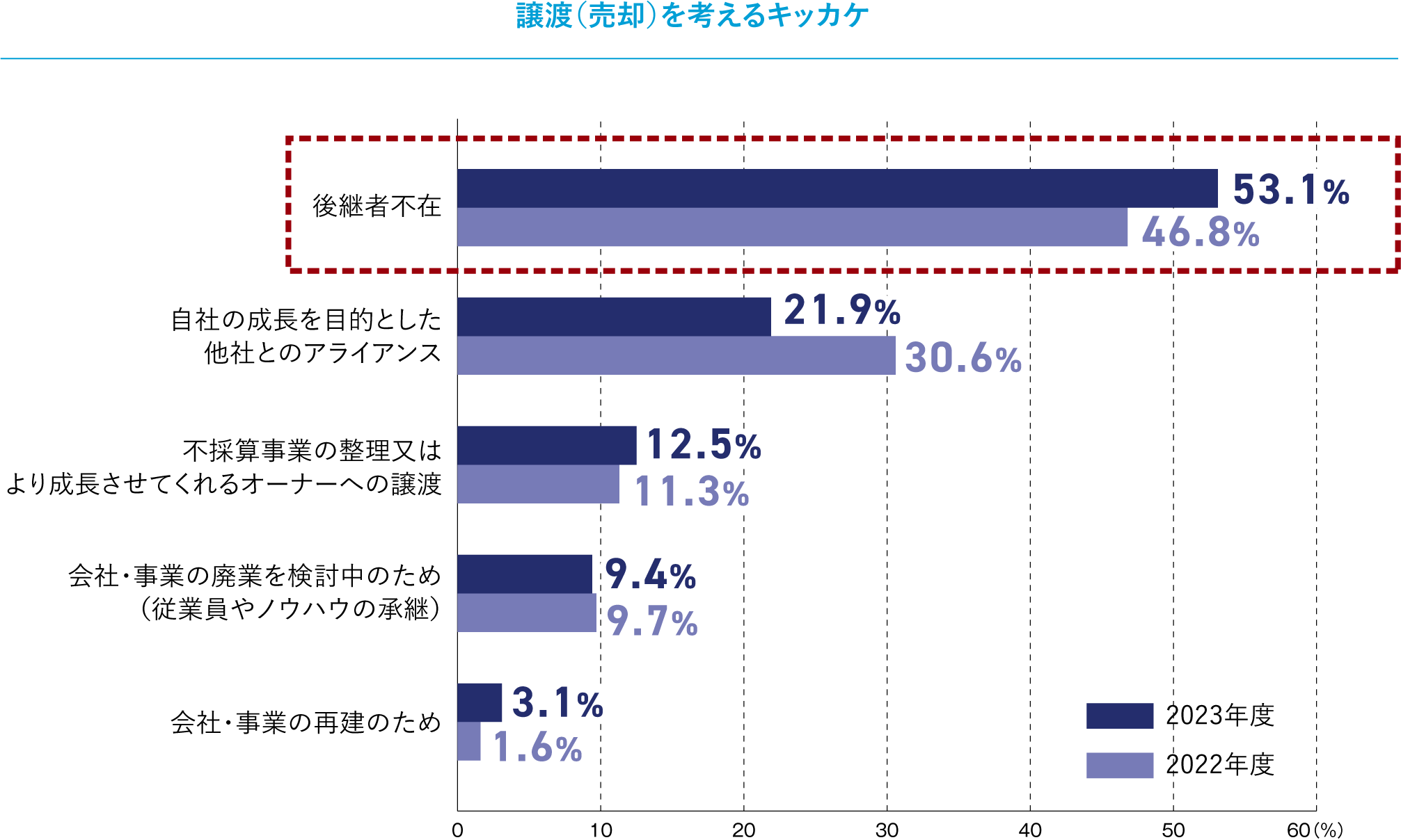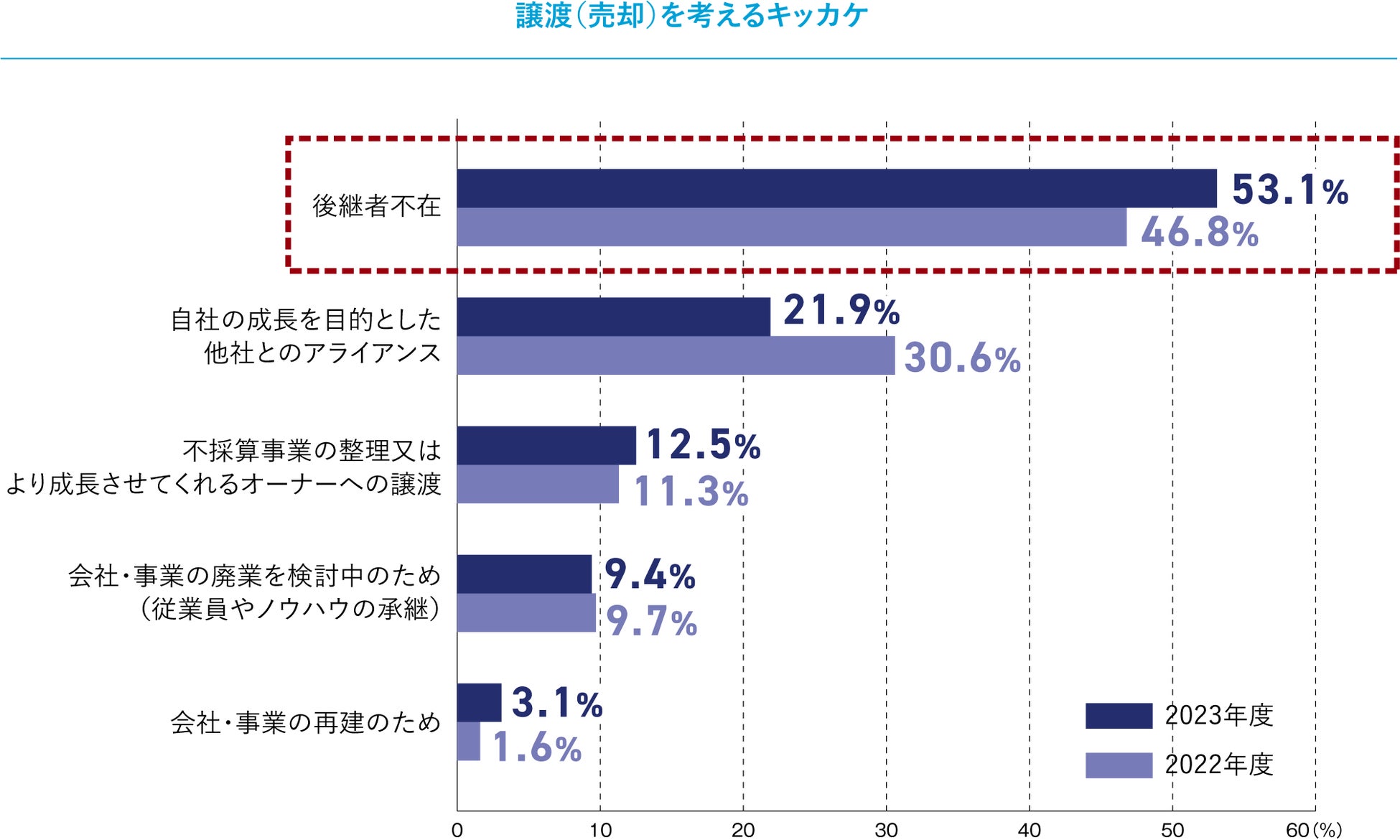 譲渡を考えるきっかけについて尋ねると、「後継者不在」(53.1%)が圧倒的に高く、次いで「自社の成長を目的とした他社とのアライアンス」(21.9%)という結果となりました。昨年度の同アンケートと比較すると、2023年は「後継者不在」が6.3ポイント増加し、「自社の成長を目的とした他社とのアライアンス」が8.7ポイント減少。「不採算事業の整理又はより成長させてくれるオーナーへの譲渡」など、他理由においては昨年とほぼ同じ回答結果であることから、譲渡を考えるきっかけは、近年、社会問題化している「企業の後継者不在」であることがうかがえます。