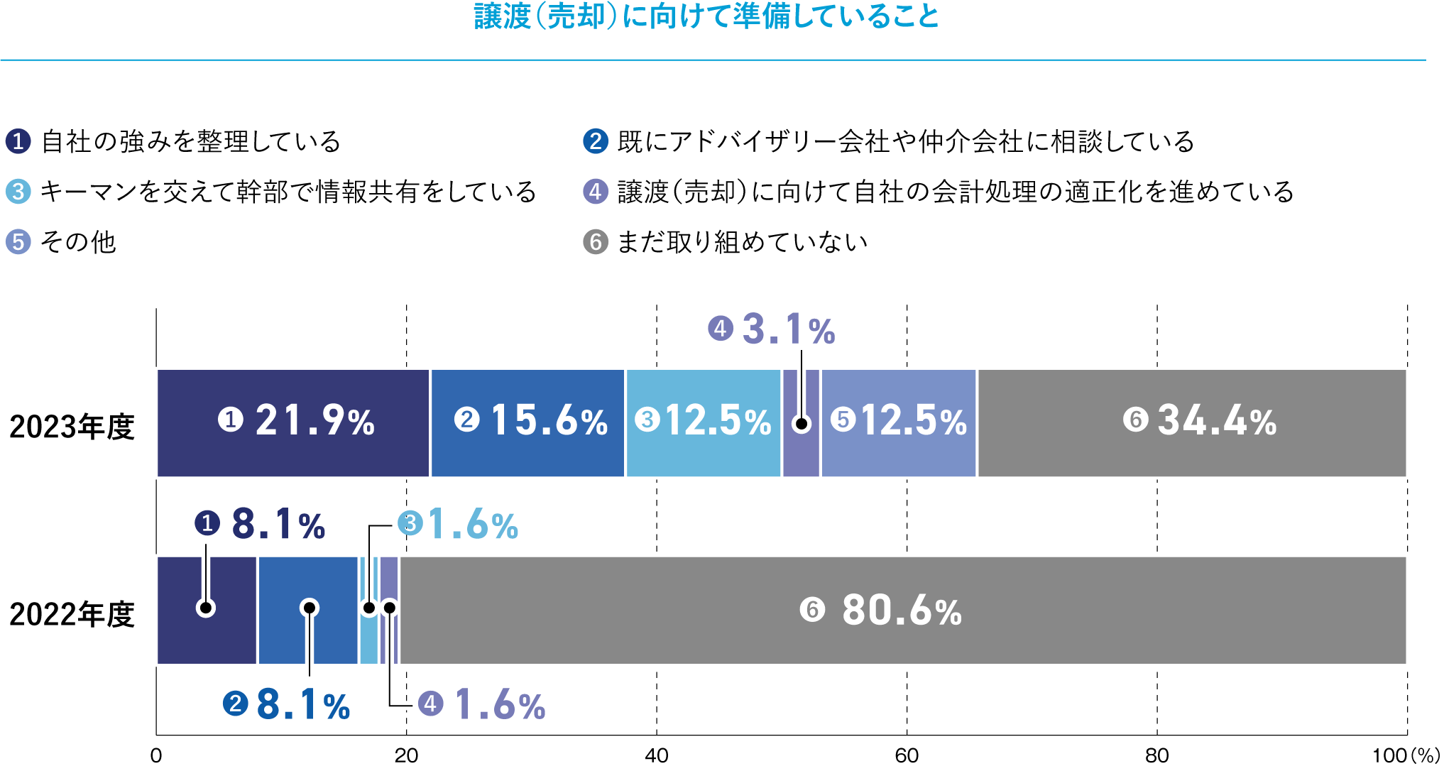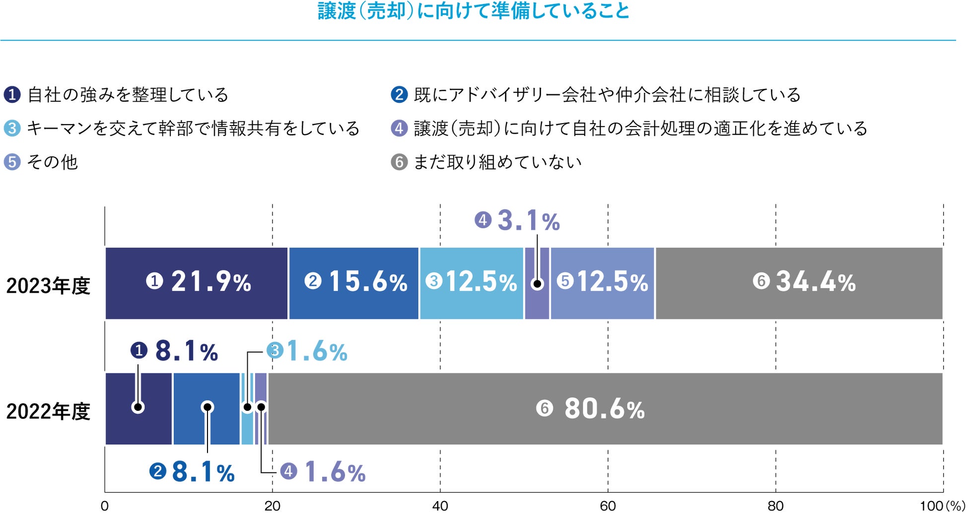 一方で、「まだ取り組めていない」との回答は34.4%という結果に。昨年度は80.6%という結果から、46.2ポイント減の大幅減少となりました。まだ取り組めていない企業が大幅に減少した理由として、M&Aの普及が考えられます。周りの経営者に触発され、まだ数年先の話と思っていた譲渡について検討を開始し、具体的な取り組みに移行していることがうかがえます。