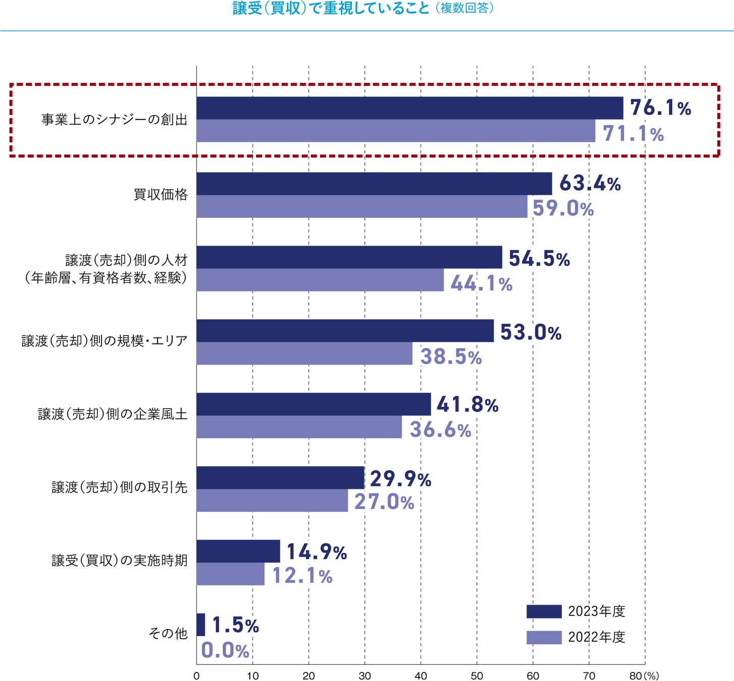 譲受で重視している項目について尋ねたところ、「事業上のシナジーの創出」(76.1%)が最多となり、次いで「買収価格」(63.4%)、「譲渡側の人材(年齢層、有資格者数、経験)」(54.5%)となりました。昨年の同設問の回答と比較をすると、回答数の多い順番に変わりはないものの、全設問において昨年より多く選択されていることがわかります。譲受側が検討において重視するポイントが多くなっており、より本格的な検討を進めている可能性が考えられます。