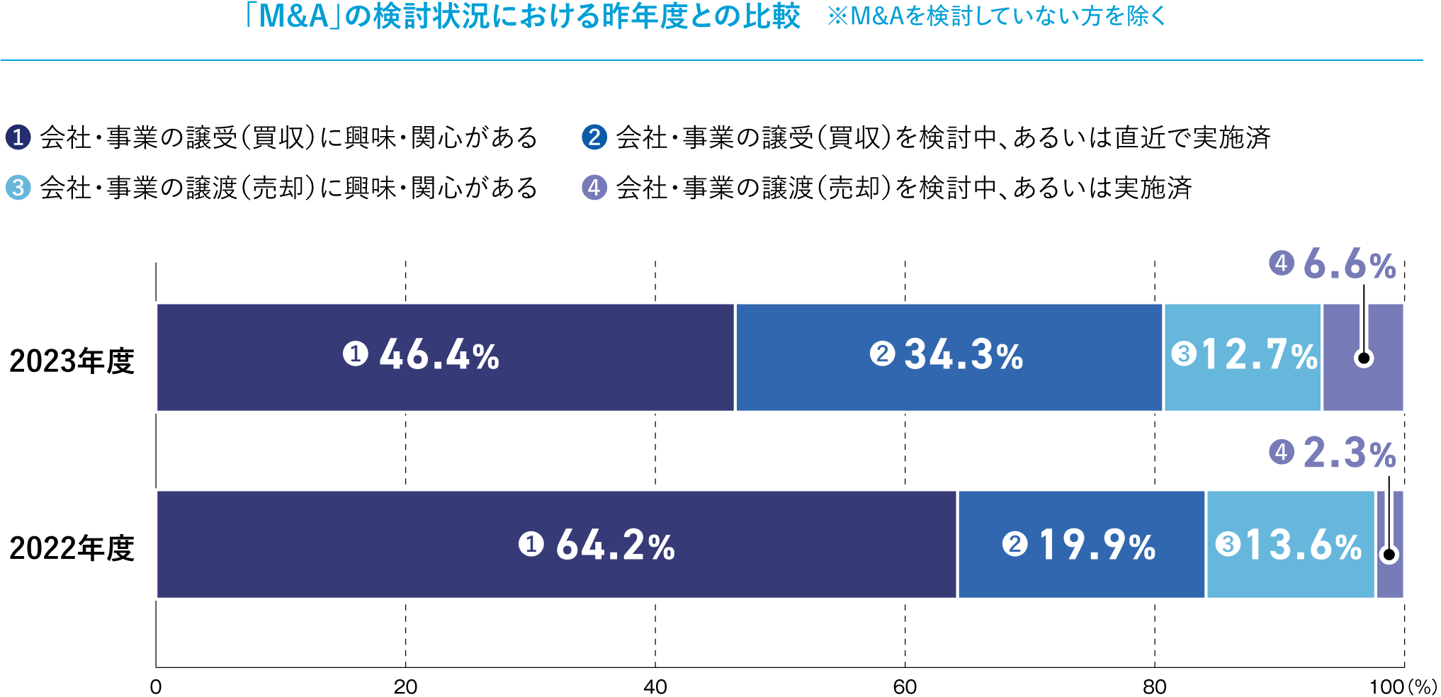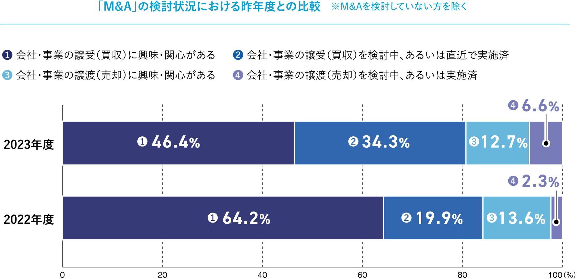 M&Aの検討状況について、「譲受(買収)・譲渡(売却)を検討中、実施済み」の企業は昨年から2倍近く増加。M&Aは「構想」から「実行」のフェーズへ移行していることがうかがえます。