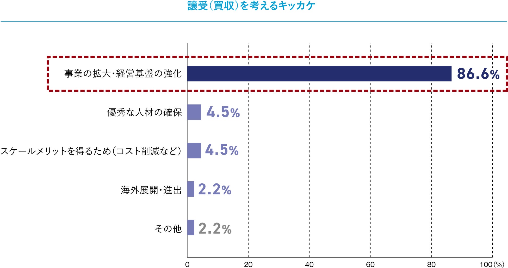 譲受を考えるきっかけについて尋ねると、「事業の拡大・経営基盤の強化」(86.6%)という回答が圧倒的に多い結果に。次いで、「優秀な人材の確保」(4.5%)、「スケールメリットを得るため」(4.5%)となりました。「海外展開・進出」は2.2%と比較的少なく、M&Aを検討するのは「事業の拡大・経営基盤の強化」など自社を成長させたいときに考えることが多いといえるでしょう。