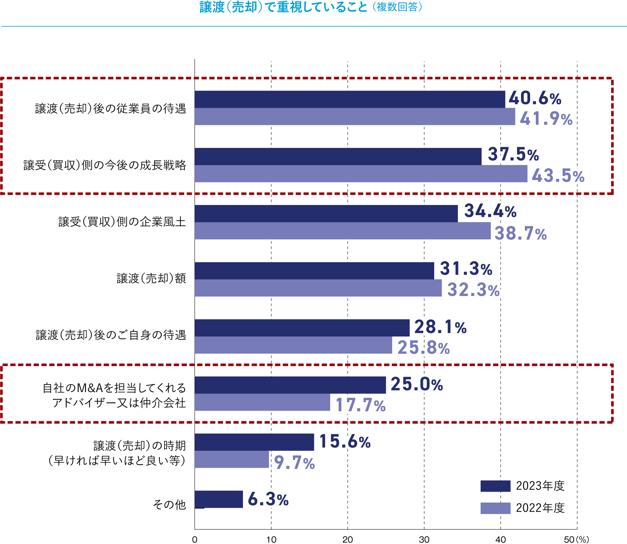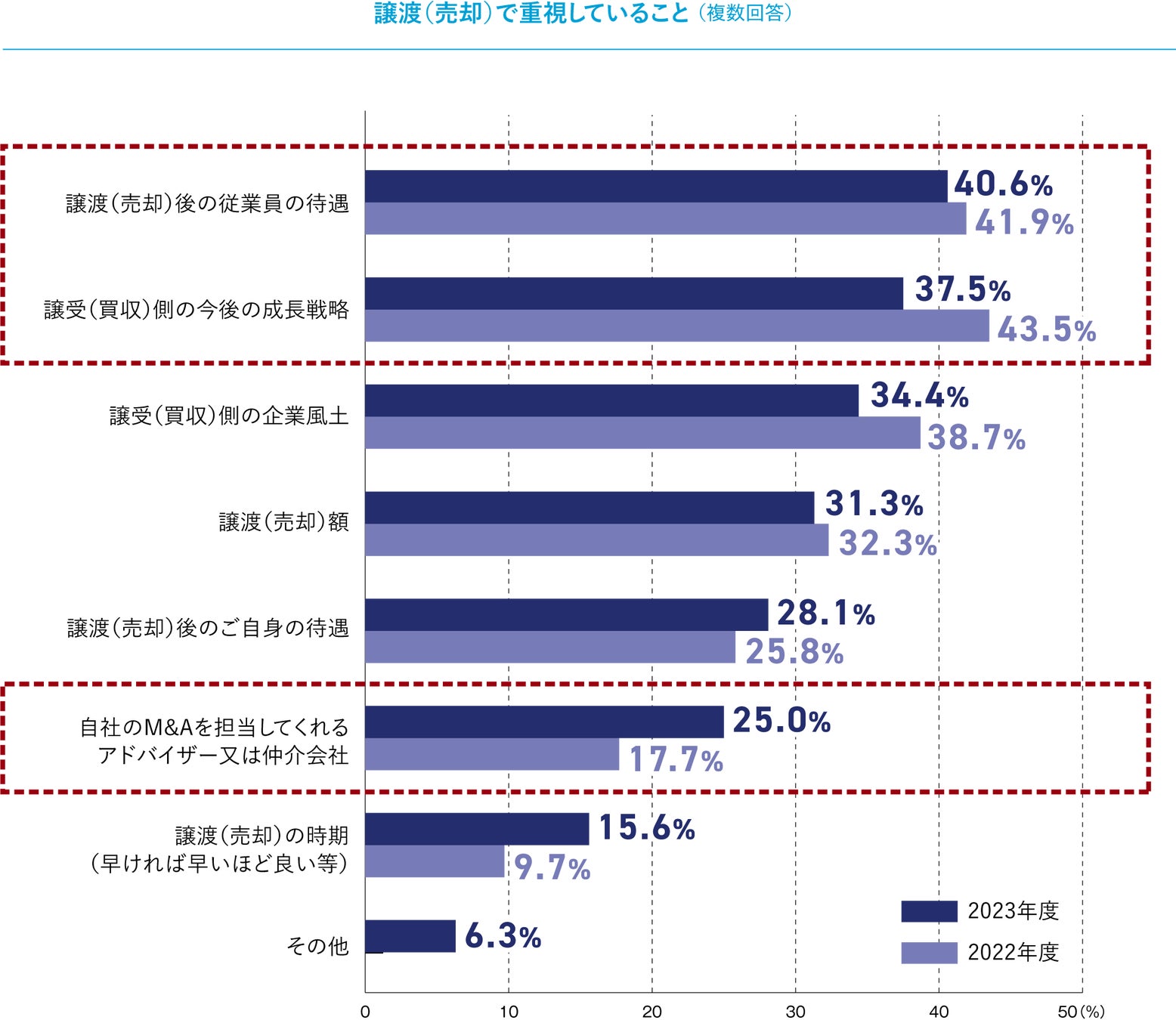 一方、「譲渡後のご自身の待遇」(28.1%)、「自社のM&Aを担当してくれるアドバイザー又は仲介会社」(25.0%)、「譲渡の時期(早ければ早いほど良い等)」(15.6%)は、前年対比で大幅な増加となりました。譲渡企業の行く末だけでなく、譲渡側(売主)の事情に関連する項目にもスポットが当たっており、より本格的にM&Aを実行に移している企業・株主が増えていることがうかがえます。