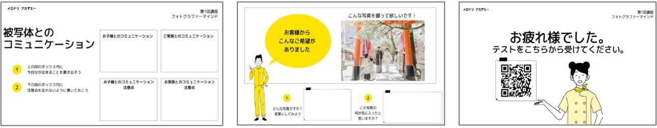 全9の講座をご用意し、好きな時間に受講が可能です。1つの講座が終了するごとにオンラインのテストを受けていただくことで復習にもつながり”カメラマン”としての知識を身に着けることが可能です。