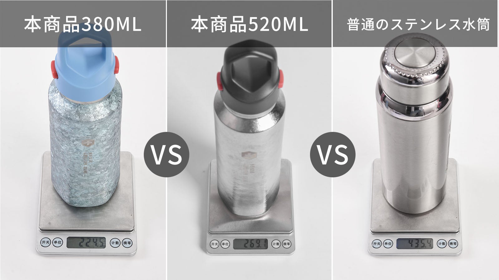 チタンは鉄の3分の2、銅の2分の1の重さなので持ち運びには最適な素材です。500mlのステンレス製水筒の重量は430gを超えますが、520mlの容量を持っているSWISS MILITARY純チタン六角形ボトルは約269gしかありません