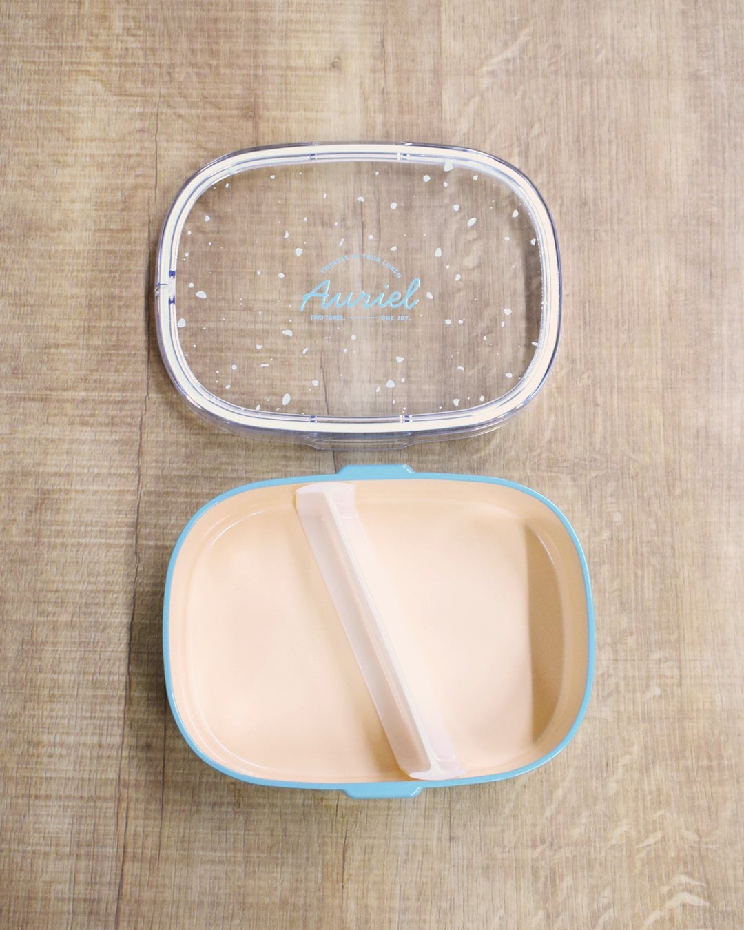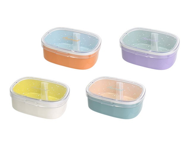 手になじみのいいオーバル形状の1段ランチボックス。ワンタッチでオープン&クローズ。かちっとはまるのでベルトや止め具がなくても持ち運びに安心感があります。透明のフタには手書き風のロゴがプリントされています。容器は外側と内側の色が異なり、色の組み合わせがおしゃれな印象。ななめの仕切り付き。フタ以外食洗機対応で機能性も抜群です。