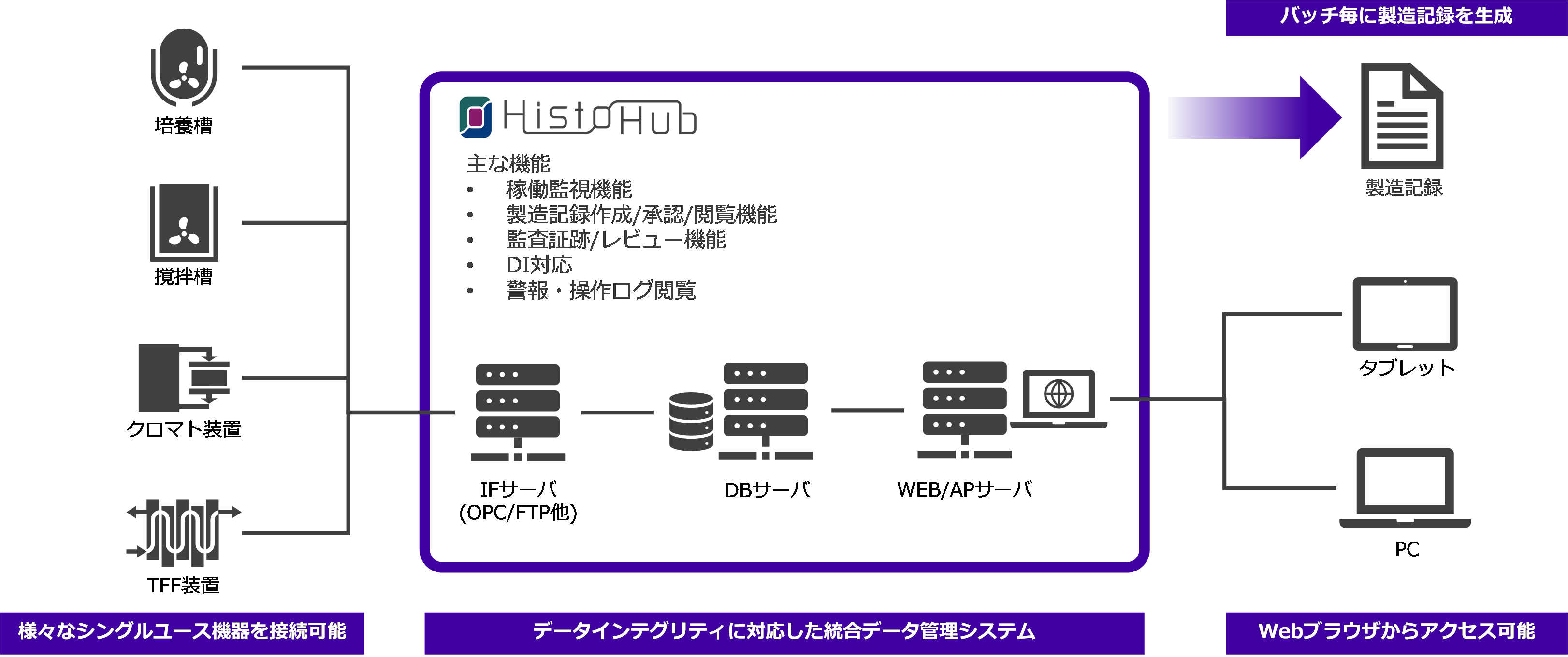 HistoHub®に接続されている機器からの製造データ(運転データおよび操作履歴/警報などのログ情報)が通信機能により収集され、HistoHub®内のデータベースサーバにデータインテグリティに沿って一元管理されて保存されます。保存された運転データは、製造記録閲覧画面においてトレンドグラフで確認可能であり、各種ログ情報は一覧を画面で確認可能です。